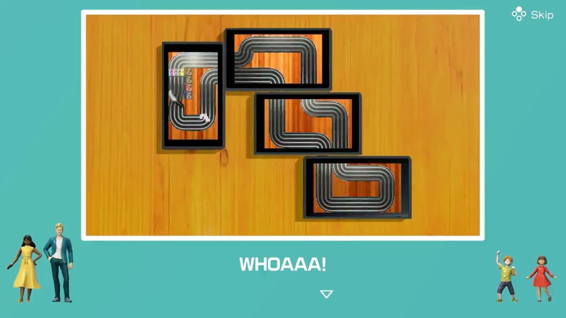Einen ganz besonderen Multiplayermodus stellt die zweite lokale Möglichkeit dar: der Mosaikmodus. Hier können bis zu vier Switches aneinandergelegt werden, um zusammen ein größeres Spielbrett zu erzeugen. So können etwa im Spiel Angeln mehrere Switches zu einem ganzen Flusslauf zusammengelegt werden. Stellen wir wiederum eine Switch schräg an die anderen liegenden Switches, so erzeugen wir einen kleinen Wasserfall. Ebenso lässt sich durch das Aneinanderreihen mehrere Switches die Autorennbahn Nintendos Carrera-Ableger vergrößern.