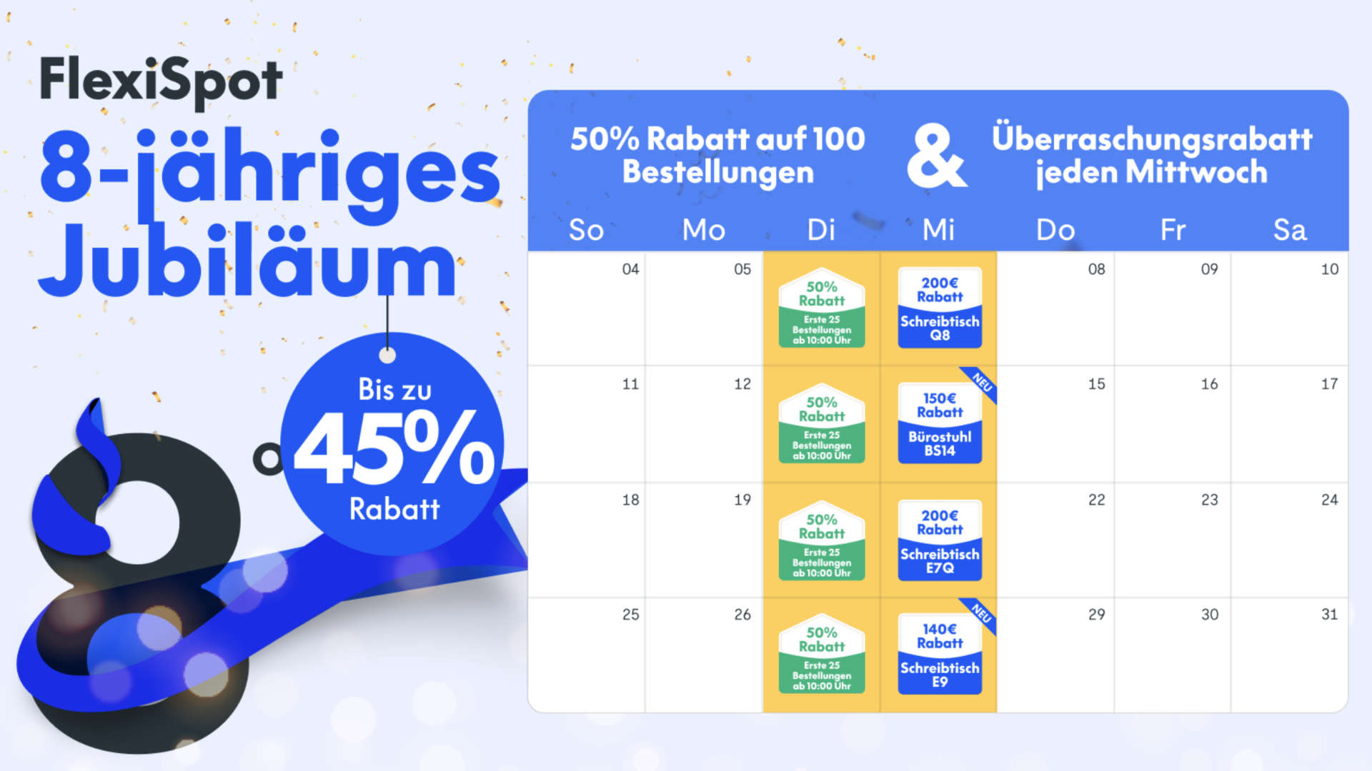 Der Büromöbel-Hersteller FlexiSpot feiert im August 2024 seine Gründung. Zu Ehren des 8. Jahrestages von FlexiSpot gibt es exklusive Blitzverkäufe und auch länger verfügbare Rabatte auf der Website.
