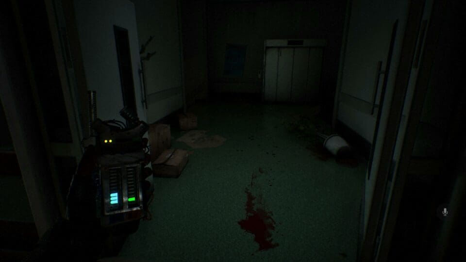 Bei jedem Schritt müssen wir auf unsere Umgebung achten, um nicht an Gegenstände anzustoßen oder auf Glasscherben oder Ähnliches zu treten. Dazu müssen wir uns auch noch sehr langsam bewegen, denn unsere Schritte sind selbst bei leisem Untergrund zu hören, sobald wir zu schnell gehen. Türen öffnet ihr am besten in Zeitlupe und Schubladen und Kästen ebenfalls. Neigt die Sticks am Gamepad also nicht zu stark und lasst euch Zeit, nur so könnt ihr überleben.