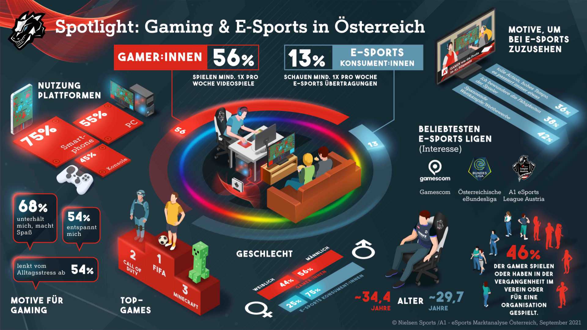 Die Gaming- und E-Sports-Branche hat sich nicht nur weltweit zu einem Milliardenbusiness entwickelt, sondern ist auch in Österreich in den letzten Jahren stark gewachsen. Bereits 2019 hat A1 in Zusammenarbeit mit Nielsen Sports, einem der weltweit führenden Forschungs- und Beratungsunternehmen in der Sport- und Entertainmentbranche, eine Marktanalyse rund um die Themen Gaming und E-Sports durchgeführt. Nun wurden die Ergebnisse der Neuauflage 2021 im Rahmen der Eröffnung des A1 eSports Pop Up Hubs präsentiert.