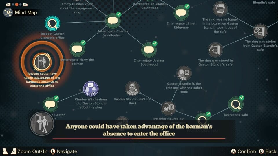 New York, Mallorca, ein Luxusschiff in Ägypten – dazu ein Mordopfer und unzählige Verdächtige. Einfach hat man es als Detektiv nicht. Aber dafür ist die Spiel-Engine inzwischen recht ausgereift und lässt euch in Ruhe eurer Detektivarbeit nachgehen. Und die besteht vor allem in unzähligen Gesprächen mit anderen Personen – die alle irgendwie verdächtig sind und meistens auch zumindest Irgendetwas zu verbergen haben. Fast jeder lügt euch mehr oder weniger an, oder erzählt zumindest nur die halbe Wahrheit. Ihr sammelt Hinweise, redet mit jedem bis er/sie nichts mehr zu sagen hat und stellt danach logische Verbindungen her, indem ihr eine Mindmap erstellt. Mit dieser Mindmap könnt ihr dann (meistens sogar nachvollziehbare und logische) Schlussfolgerungen ziehen und die Geschichte vorantreiben. Eigentlich klickt ihr aber nur auf alle vorgegebenen Möglichkeiten, bis das Spiel endlich die richtige Lösung akzeptiert. Das fühlt sich aber trotzdem zeitweise wie echte Detektivarbeit an.