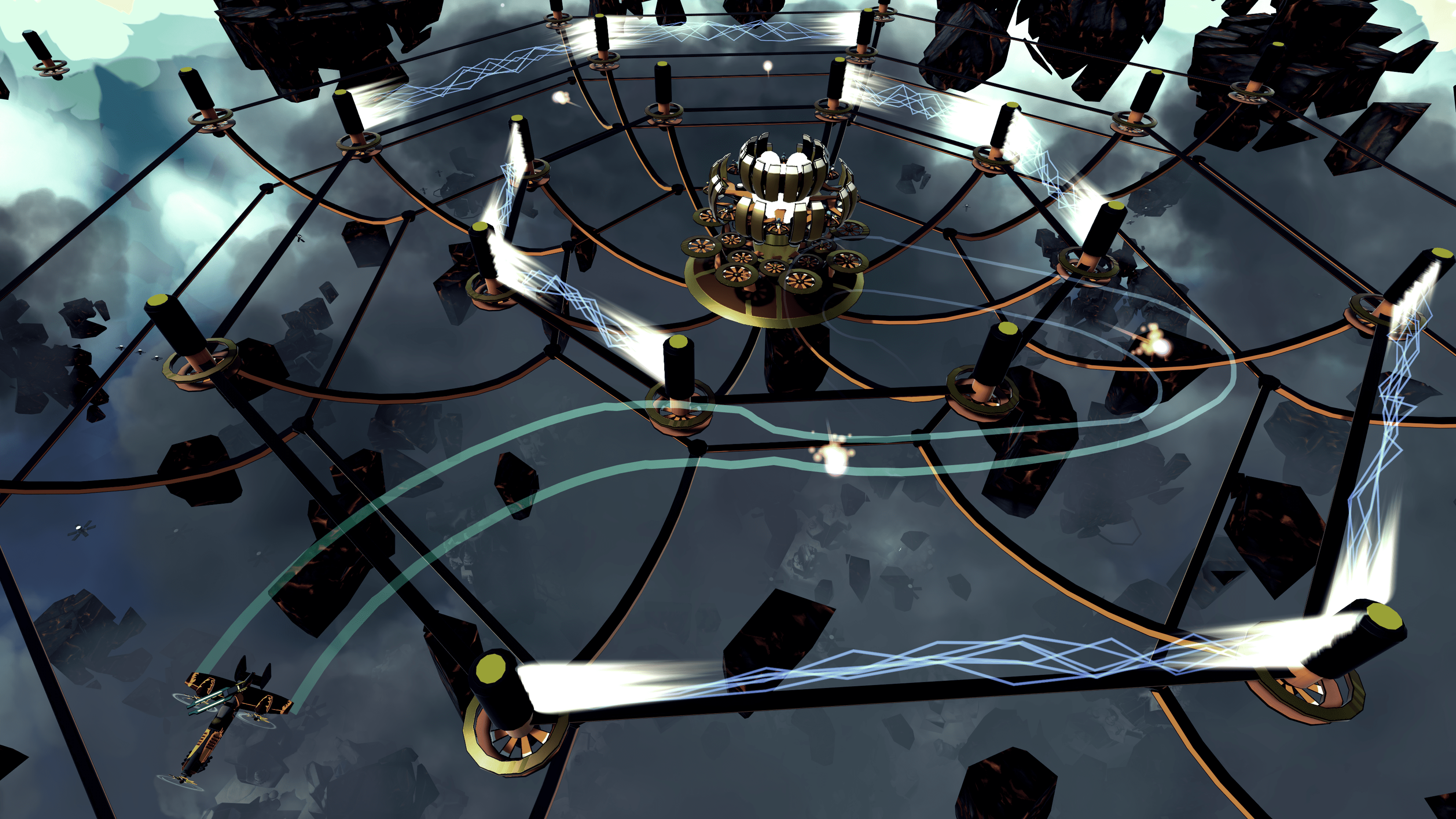 Habt ihr euer Schiff dann letztendlich mit euren neuesten Erfindungen ausgerüstet, geht es weiter in höhere Luftschichten. Hierfür müsst ihr in jedem Level ein entsprechendes Portal nutzen. Befinden sich Gegner in der Nähe, sind diese Portale geschlossen und ihr müsst zunächst mal ringsum aufräumen. Gekämpft wird dafür mit diversen Schusswaffen, die ihr mit dem rechten Stick ausrichtet und mit R2 abfeuert, sowie einer Harpunenwaffe, die ihr mit L2 nutzt. Während die Feuerwaffen unterschiedlich Arten von Schaden anrichten (durch einzelne Schüsse, einen durchgehenden Laserstrahl und mehr), müsst ihr die Harpune ab und an auch für kleinere Tricks nutzen: So gibt es etwa Gegner, die so stark gepanzert sind, dass eure Hauptwaffen gegen sie nutzlos sind – sendet ihr jedoch zunächst die Harpune gegen ihr Panzerplatten, könnt ihr diese abreißen und dann problemlos auf die neu entstandene Schwachstelle feuern.