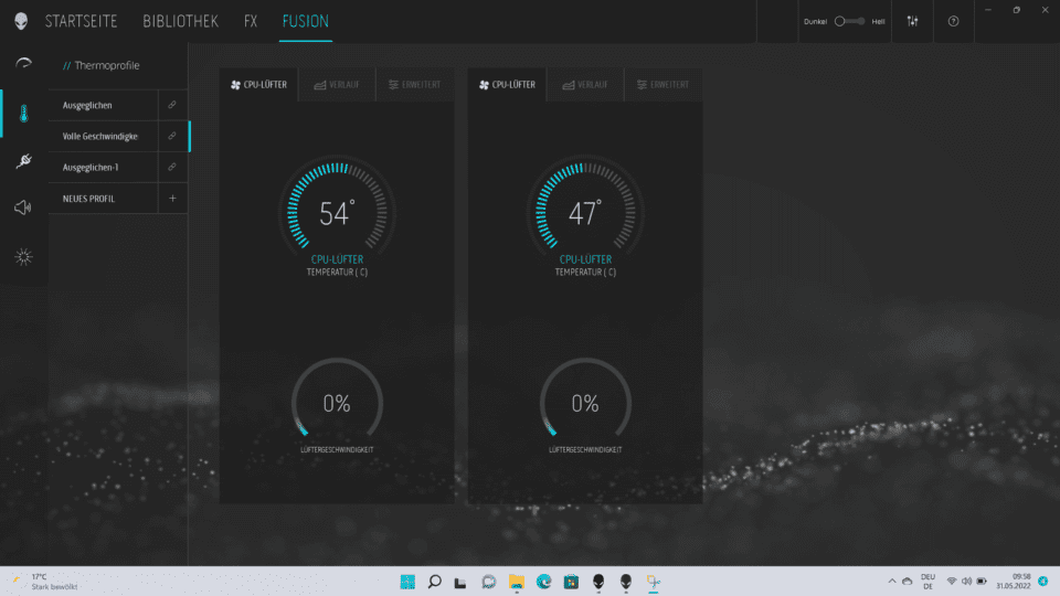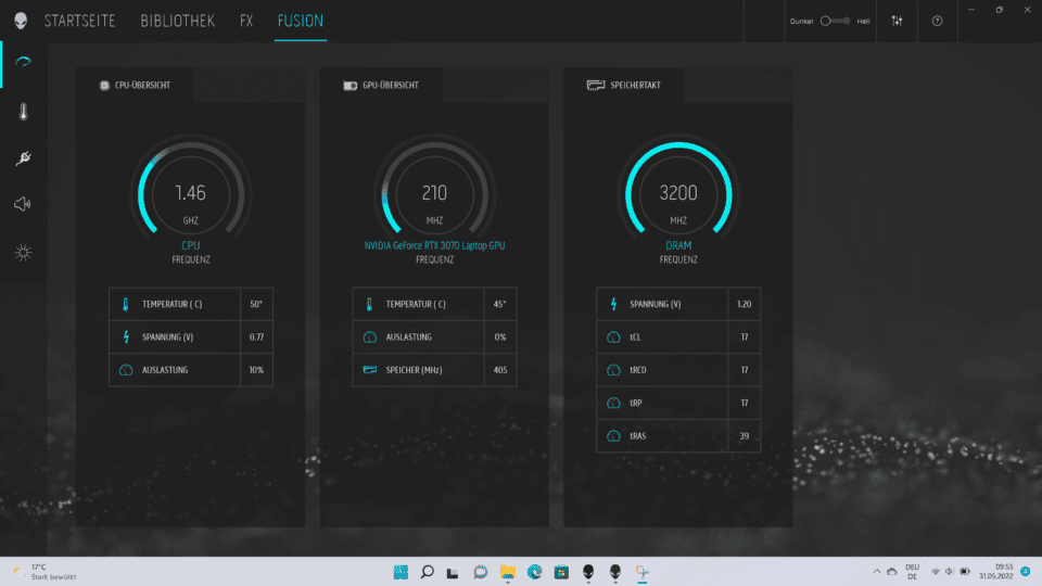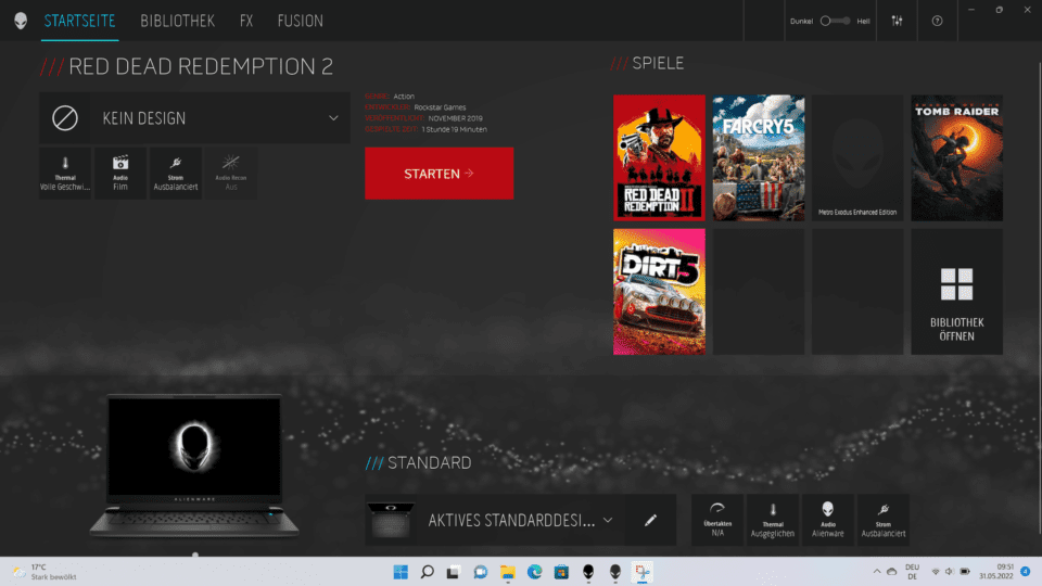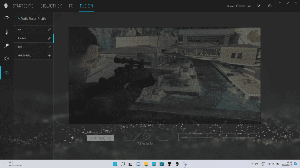 Bei meinen ersten Tests mit dem Alienware m15 bin ich ehrlichgesagt erschrocken. Sobald ich ein Spiel starten wollte und Nvidias Optimus von der integrierten AMD-Grafikeinheit auf den schnellen RTX-Chip umgeschaltet hatte, begannen die Lüfter ungeachtet von Last und Temperatur mit Maximaldrehzahl loszupusten. Und das ist laut – richtig laut. Eine Messung mittels Handyapp (also jetzt zugegeben nicht unbedingt wissenschaftlich, aber immerhin) ergab aus 20 cm Entfernung 51 Dezibel. Erst danach aber besann ich mich darauf, lieber zu checken, ob es nicht vielleicht Updates für die Gerätefirmware und/oder das Command Center gibt, das Lüfterdrehzahl und Co. ja ebenso regeln kann. Und siehe da: beides war der Fall. Also: Updates aufgespielt, Games angeworfen: Viel besser! Zugegeben: Mit nachher gemessenen 44 dB ist das Alienware m15 immer noch kein Leisetreter, dafür aber passt ja auch die Performance.