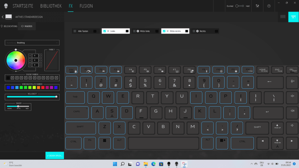Das Touchpad ist mit 10,5 x 6 cm durchschnittlich groß und die Tastatur, die zwar keinen Ziffernblock bietet, aber mit angenehmen Anschlag daherkommt, wie schon angemerkt beleuchtet, wobei die passende Farbe nach Belieben aus dem RGB-Spektrum ausgewählt werden kann. Und das nicht nur für die ganze Tastatur, sondern auch einzelne Sektionen. Möglich macht es das Alienware Command Center.