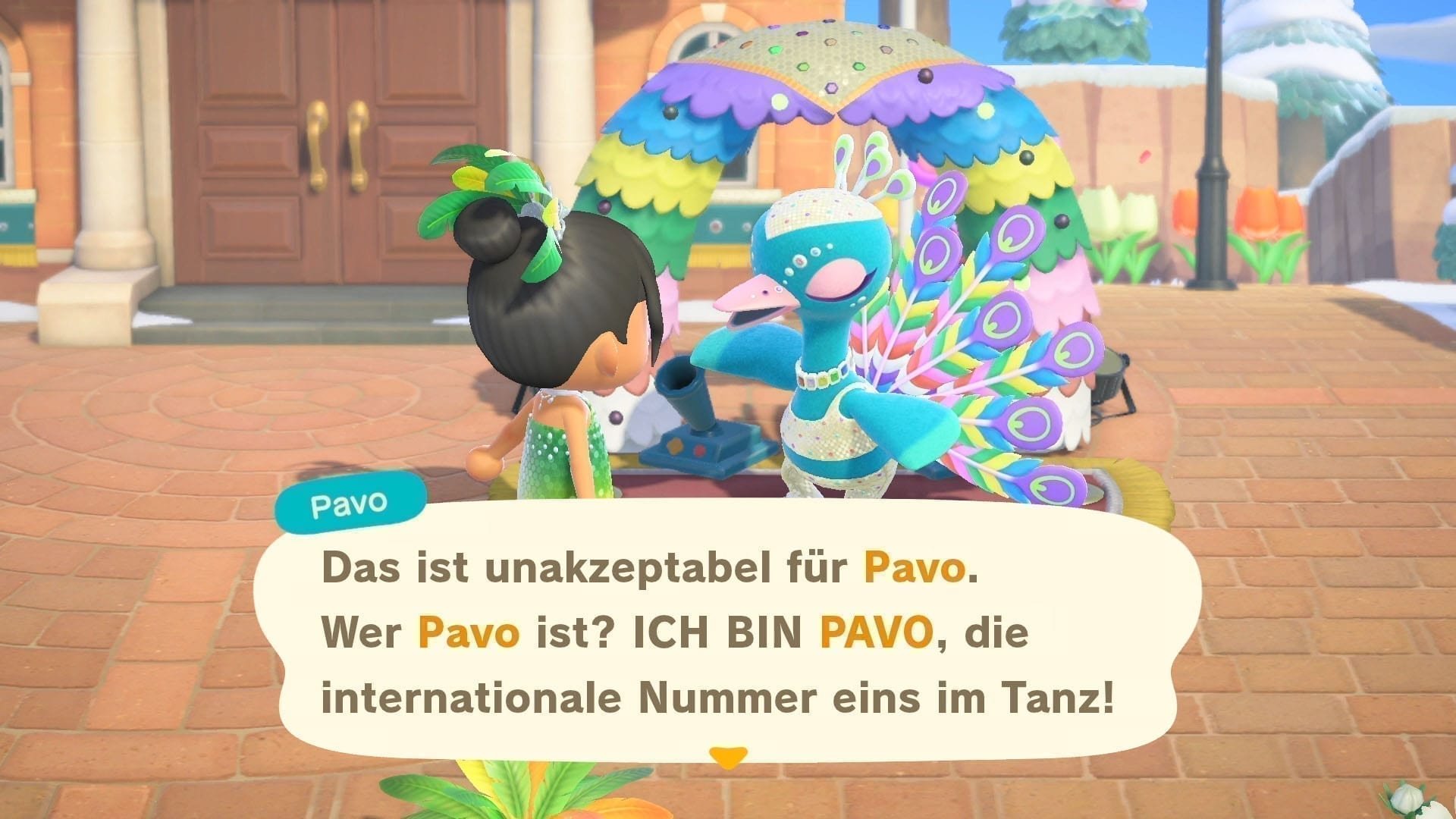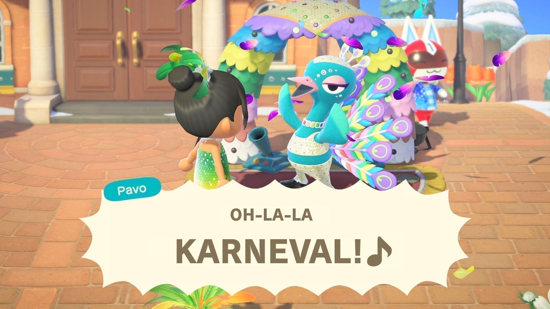 - Viva Karneval: Der farbenfrohe Karneval voller Tanzvergnügen macht das kalte Wetter vergessen. Alle, die das Servicecenter bereits erweitert haben, sind eingeladen, am 15. Februar den Tänzer Pavo – der mit reichlich Konfetti für Karnevalsstimmung sorgt – auf dem Festplatz zu treffen. Und nur an diesem Tag können Spieler:innen mit ihrem Netz die bunten Federn einfangen, die über die Insel schweben. Wer sie bei Pavo eintauscht, bekommt eine mitreißende Tanzeinlage zu sehen. Ein besonders seltener Anblick sind die farbenfrohen Regenbogenfedern: Wer eine erspäht, sollte sie möglichst fangen und Pavo bringen. Wer über eine Nintendo Switch Online-Mitgliedschaft verfügt, kann natürlich auch Freund:innen einladen oder sie auf ihren Inseln besuchen, um gemeinsam zu feiern.