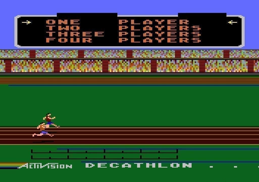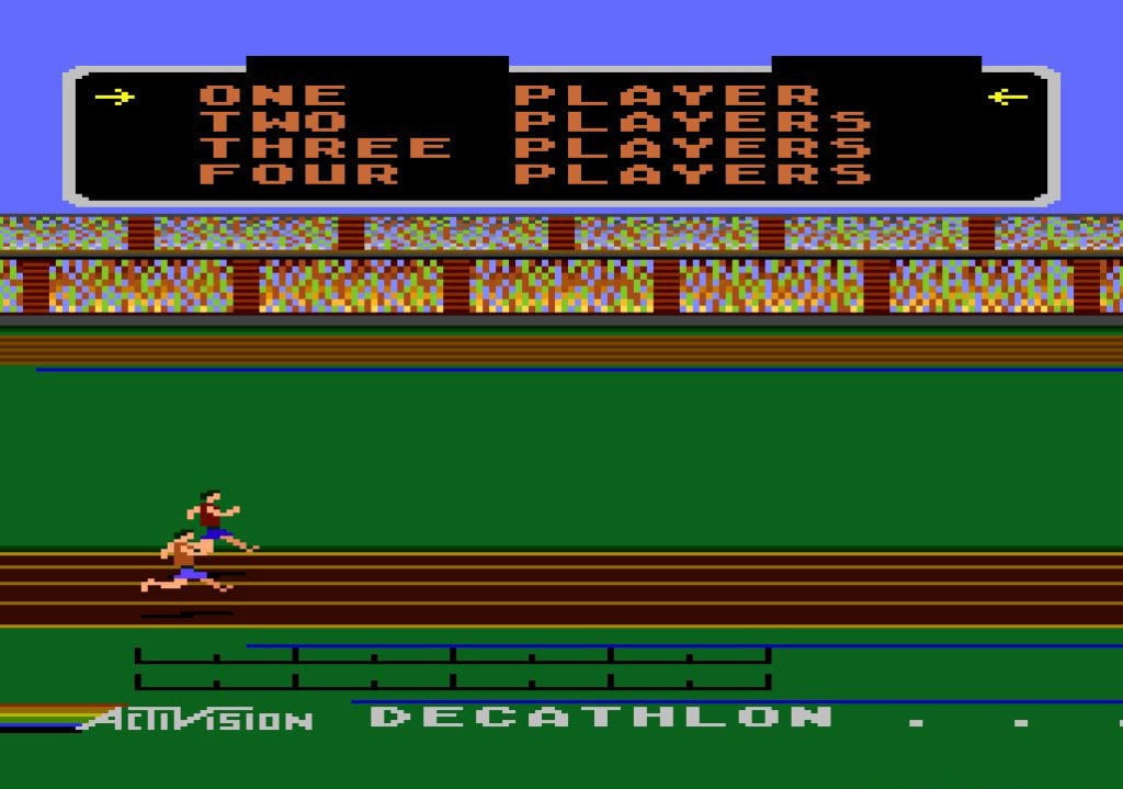 Ein paar Jährchen später durfte sich der Sportspielefan schon im virtuellen Zehnkampf versuchen und das auf Atari 2600 und C64. Von David Crane entwickelt waren gleich 10 Einzelspiele in einem Modul untergebracht. An Decathlon von Pulisher Atari kann ich mich noch gut auf meinem Commodore 64 erinnern, bei den einzelnen Disziplinen wurde durch wildes Links- und Rechtsrütteln am Joystick Tempo aufgenommen und im richtigen Moment drückt man den Feuerknopf zum Springen oder zum Abwurf etwa des Speers. Diese andauernde Belastung hielten, obwohl damals schon sehr robust gebaut, die meisten Joysticks nur eine begrenzte Zeit durch, schnell sprach man von den sog. „Joystick-Killern“.