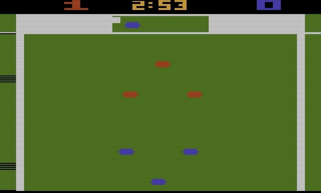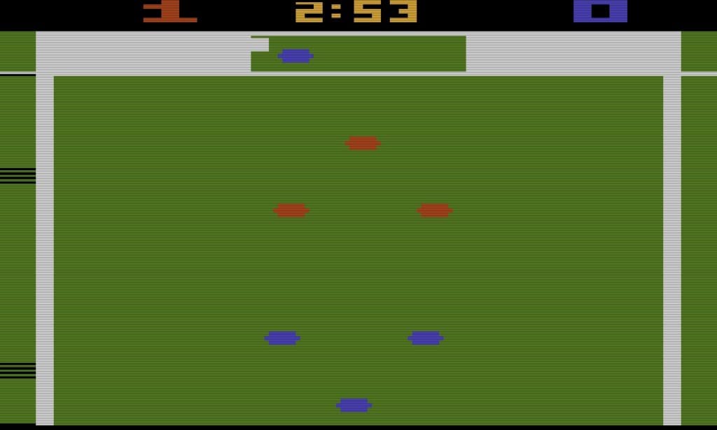 Für die Atari 2600 Konsole wurde gut 10 Jahre nach Pong Pele’s Soccer veröffentlicht, eine Art verbesserte Version von Pong, man konnte jetzt mehrere Spieler benutzen, es gab eine Rasenspielfläche und Torleute. Aus der Vogelperspektive wurden die Spieler, die eher wie bunte Pixelkleckse aussahen, gesteuert um den Gegner mit dem Ball ein Tor zu schießen. Aber immerhin das mehr oder weniger erste Fußballvideospiel.
