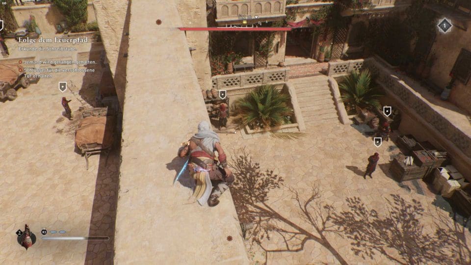 Relativ schnell bemerken wir im Spielverlauf wie wichtig neben dem Auskundschaften der Gegend, es auch ist diese dann auch auszunutzen, wo wir beim eigentlichen Parkour-System wären. Bagdad mit seinen vielen Gassen, Häusern und Mauern bietet eine große Spielwiese für unseren Bewegungsdrang als Ober-Assasine. Leider ist die Steuerung dabei stellenweise recht unpräzise wie wir schon bei unserem Anspielen feststellen mussten. In Assassin’s Creed Mirage ist es oft wichtig schnell vor den Feinden über Häuserdächer zu flüchten, oder einen hohen Turm einer Moschee zu erklettern um die Gegend synchronisieren zu können. Sprich damit einen Schnellreisepunkt freizuschalten. Das alles wird durch ein „halbautomatisches“ Parkoursystem bewerkstelligt, welches uns zwar zum einen ermöglicht leichter luftige Höhen zu erreichen, aber auf der anderen Seite selbst entscheidet wohin der nächste Schritt geht. Und genau da liegt das Problem, den dadurch bleibt unser bester Basim öfter mal wo hängen als im lieb ist, steigt gerne mal daneben oder wo hinauf wo er gar nicht sollte.