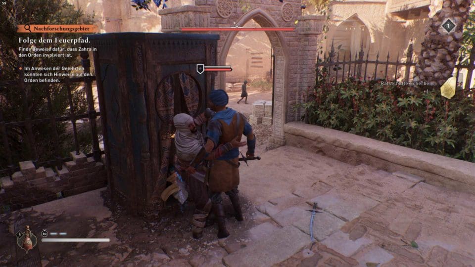 Also checken wir unserem „Assassinen-Sinn“, sprich Fokus die Gegend aus und sehen dabei die Gegner in „Rot“ markiert und auch weitere wichtige Ziele wie Beutetruhen oder Artefakte in gelb markiert. Apropos Artefakte, als Meisterdieb können und müssen wir sowohl Zivilisten, als auch Schurken ihre Börsen durch Taschendiebstahl leeren. So kommen wir nicht nur an das notwendige Kleingeld für den Händler, wir gelangen dadurch auch an andere wichtige Gegenstände wie Artefakte, Token oder geheimnisvolle Scherben. Die Aufträge, die uns durch die Story führen sind in einer Art Nachforschungsmechanik abgebildet und der Spieler muss ein bisschen selbst herausfinden, wohin die Reise als Nächstes geht. So sammeln wir Puzzlestücke und Informationen zusammen um den nächsten Schurken zu enthüllen, dem es ans Leder gehen soll. Gewürzt hat Ubisoft das mit weiteren Aufgaben, wie Schlüssel und Waren besorgen, Personen belauschen, oder das eine oder andere Rätsel lösen.