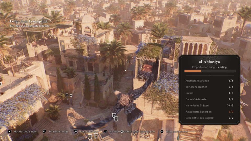 Die Entwickler haben die Stadt Bagdad im 9. Jahrhundert wirklich mit viel Liebe zum Detail in Szene gesetzt, wer neben dem Schleichen und Meucheln gerne auch noch etwas sein Wissen erweitern möchte, sammelt am besten die ganzen Kodexeinträge die über das Gebiert verteilt sind. Diese vermitteln viel historisches Wissen zu den Gebäuden, Völkern und wichtigen Stätten. Also gibt’s in Assassin’s Creed Mirage gleich die Geschichtsstunde gratis dazu 😉