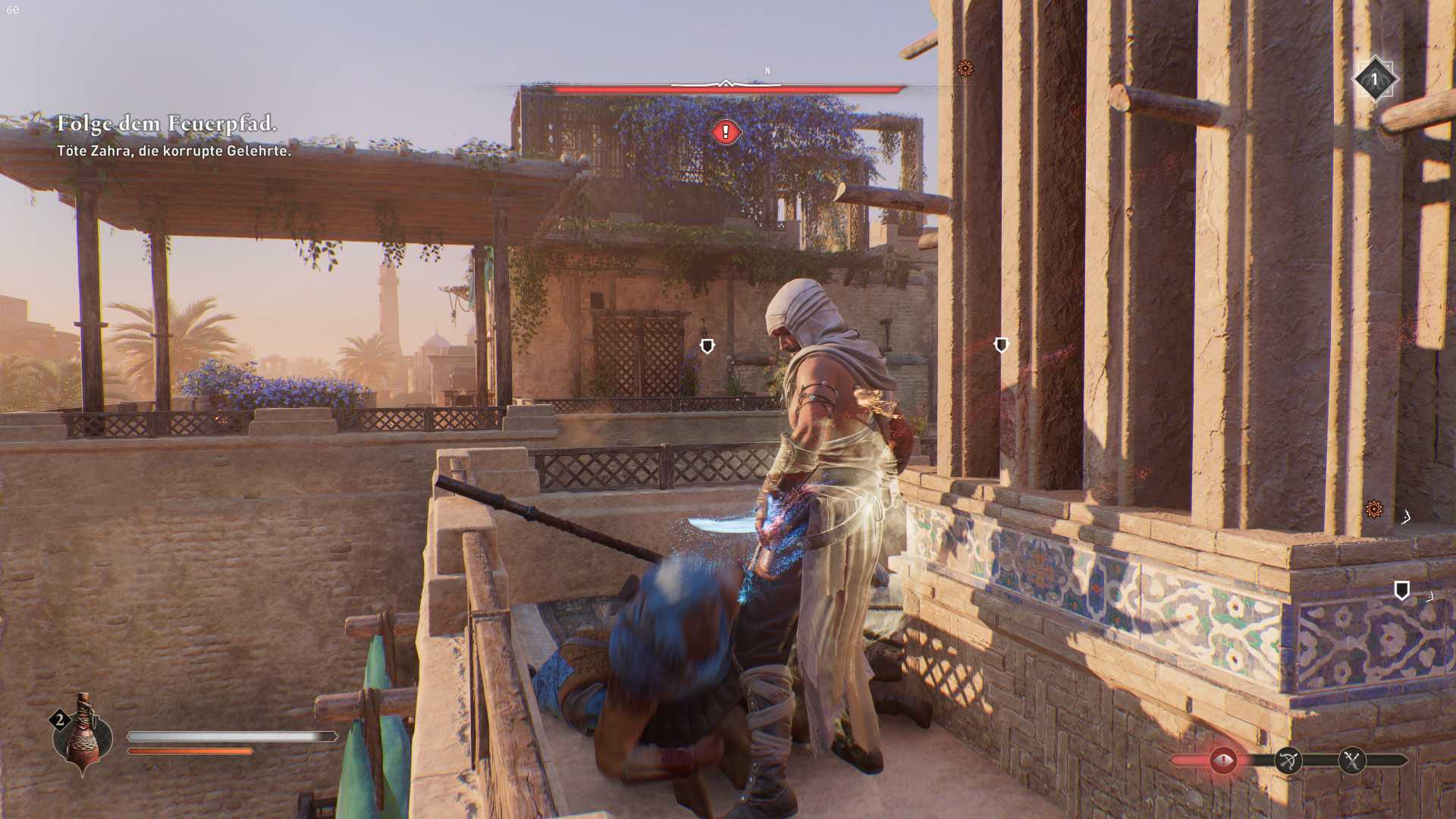 Das treibt einem in manchen heiklen Situationen den Blutdruck gewaltig in die Höhe, wenn Basim bei der Flucht wieder mal am nächsten Blumentopf hängenbleibt oder daneben springt und in den Abgrund plumpst. Das ist ärgerlich, aber macht das Spiel beileibe nicht unspielbar, nur eben nicht so präzise wie ich es mir gewünscht hätte.