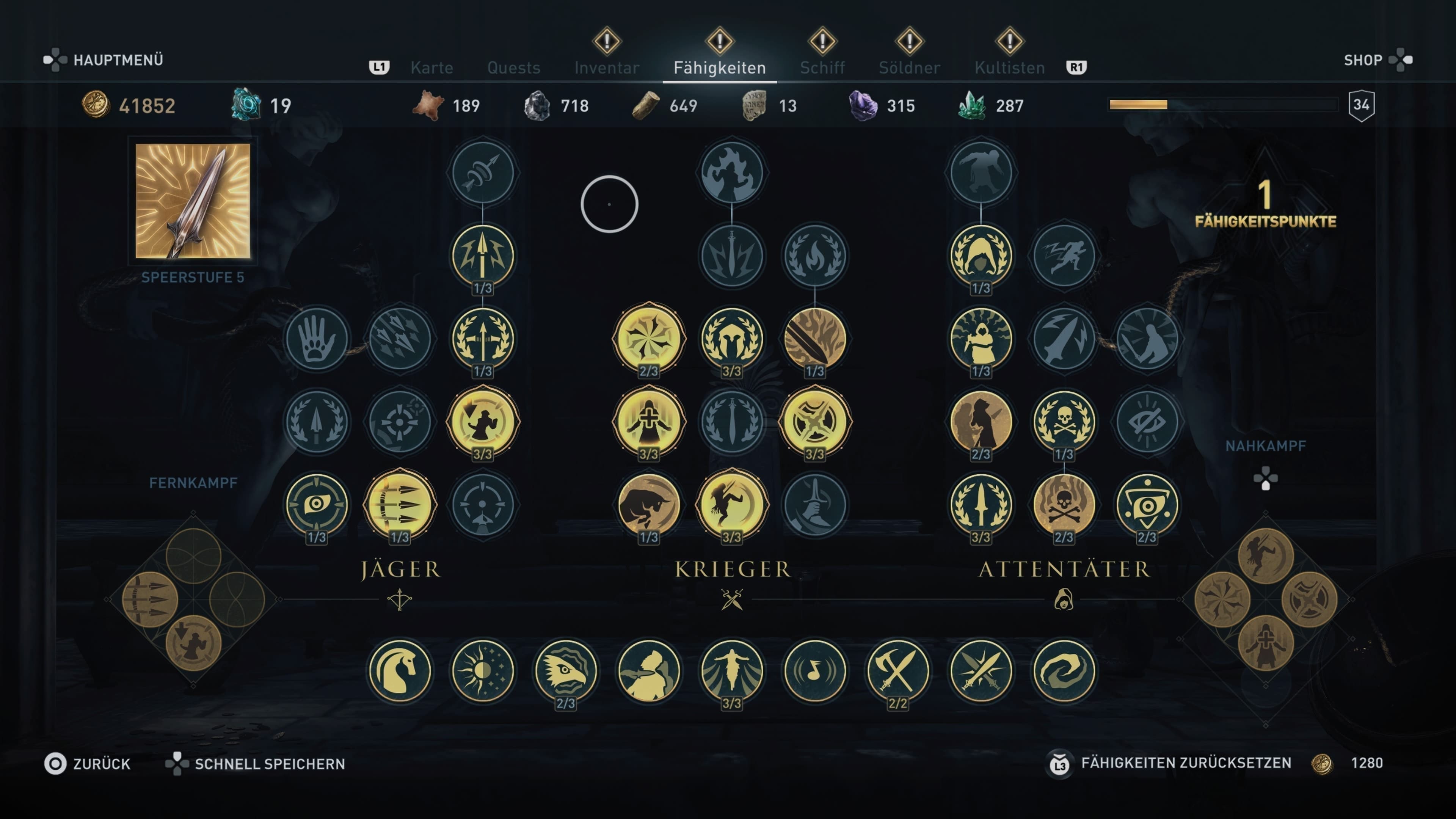 Wie bereits aus Assassin’s Creed: Origins bekannt, besitzen die Waffen unterschiedliche Perks und Qualitätslevel (selten bis legendär) und können beim Schmied im Austausch gegen eine ordentliche Summe Rohstoffe und Drachmen an das eigene Level angepasst oder mit einer Gravur versehen werden, wodurch sie zusätzliche Attribute verliehen bekommen. Verschiedene Gravuren werden im Laufe des Spiels freigeschaltet und bieten eine Reihe von Möglichkeiten – von Gift- oder Brandschaden bis hin zur Steigerung der kritischen Trefferquote. Die Kämpfe spielen sich durch die Vielfalt der Waffen und Detailverbesserungen abwechslungsreich und motivierend. Der Fertigkeiten-Baum mag zwar in Assassin’s Creed: Odyssey auf den ersten Blick etwas kahler als im Vorgänger erscheinen, dafür sind die unterschiedlichen Skills sinnvoll überlegt und lassen sich im Laufe des Geschehens je nach bevorzugtem Kampfstil weiter ausbauen.