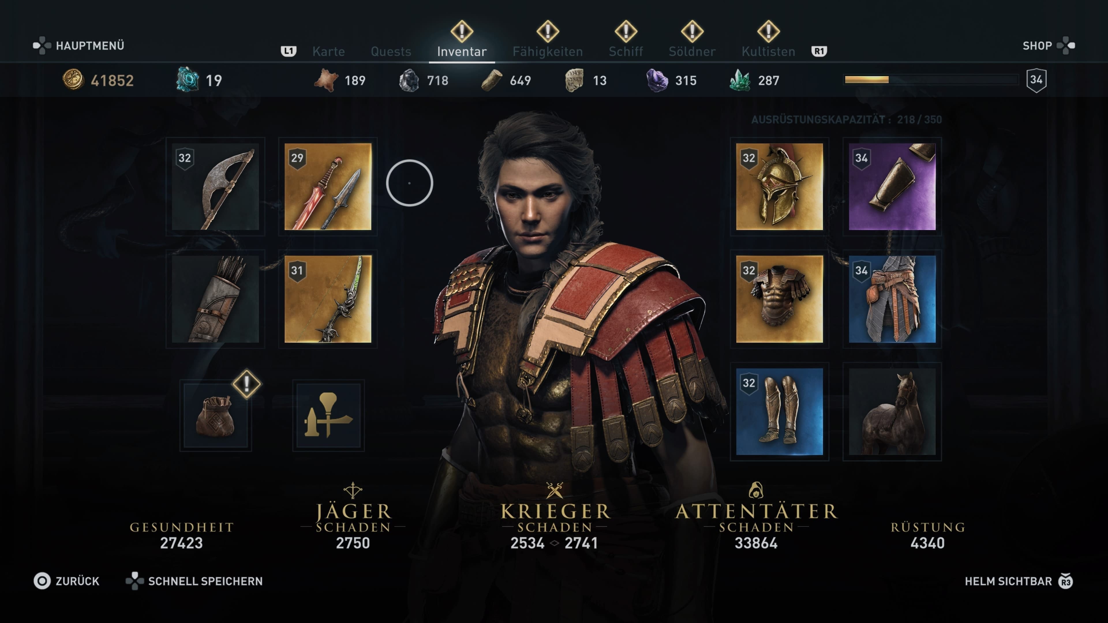 In Odyssey seid ihr nicht mehr darauf beschränkt, komplette Monturen zu finden, sondern könnt rollenspieltypisch nun auch einzelne Rüstungsteile tragen: (ausblendbare) Kopfrüstungen, Armrüstungen, Ober- und Unterteile sowie das passende Schuhwerk. Ihr könnt im Laufe des Spiels eine Vielzahl an Waffen und Rüstungsgegenständen finden, die unterschiedliche Boni und Perks bieten. Ob ihr eher defensiv vorgehen möchtet und beispielsweise Rüstungsverstärkungen skillt, oder lieber offensivere Fertigkeiten, wie beispielsweise Gift oder Feuer, zu eurem Vorteil nutzen wollt, könnt ihr durch die Ausrüstung gewisser Gegenstände mit bestimmten Perks sowie durch das Gravieren beim Schmied weiter individualisieren. Die Vielfalt der Outfits ist groß und optisch abwechslungsreich – vom spartanischen Feldsoldaten bis hin zur Jägerin mit Gesichtsbemalung. Dadurch macht es immer wieder Spaß, neue Gegenstände im Spiel zu finden. Und natürlich habt ihr auch wieder einen treuen vierbeinigen Begleiter, der immer dann kommt, wenn ihr pfeift – euer Pferd. Für euer Reittier könnt ihr diesmal ebenfalls verschiedenste Skins erwerben, vom einfachen Farbwechsel bis hin zum kitschigen weißen Einhorn inklusive Regenbogenspur. Ein Echtgeld-Shop ist ebenfalls verfügbar und auf Wunsch könnt ihr dort Skins, Waffen, Rüstungen, aber auch Erfahrungs-Booster gegen bares Geld erwerben.