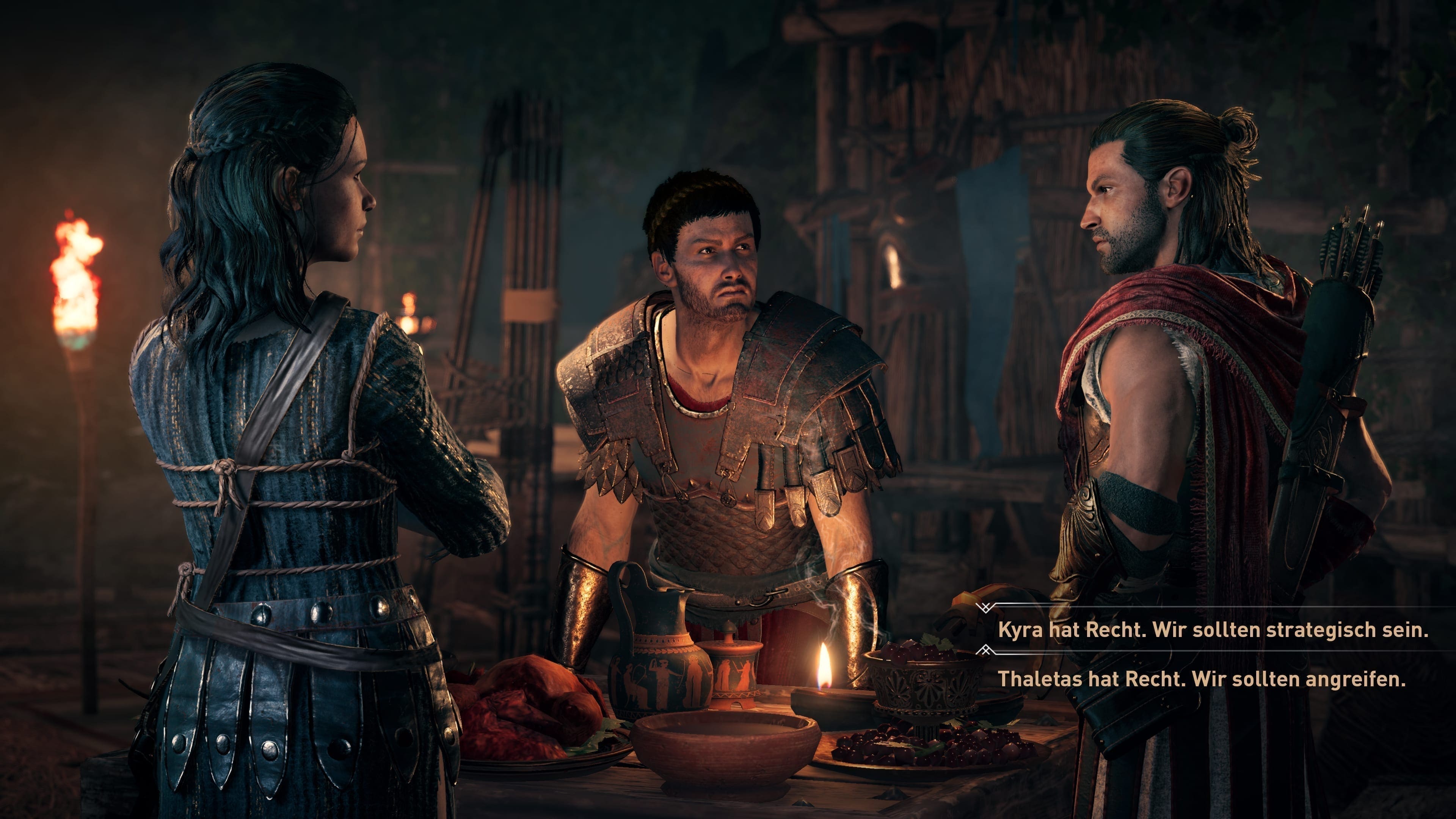 Ein weiteres neues Story-Element, welches sich Odyssey nun zunutze macht, ist Humor. Immer wieder gab es Szenen, in denen ich lachen musste, da ein Quest einen völlig absurden Akt von mir verlangte. Die teilweise sarkastischen Diskussionen im Laufe des Spiels, beispielsweise mit dem Philosophen Sokrates, lassen das Geschehen noch etwas lebendiger wirken, und auch die Romantik kommt weder auf Kassandras noch auf Alexios Odyssee zu kurz – immer wieder zeigen sich diverse Spielfiguren mehr als erfreut, auf euch zu treffen …