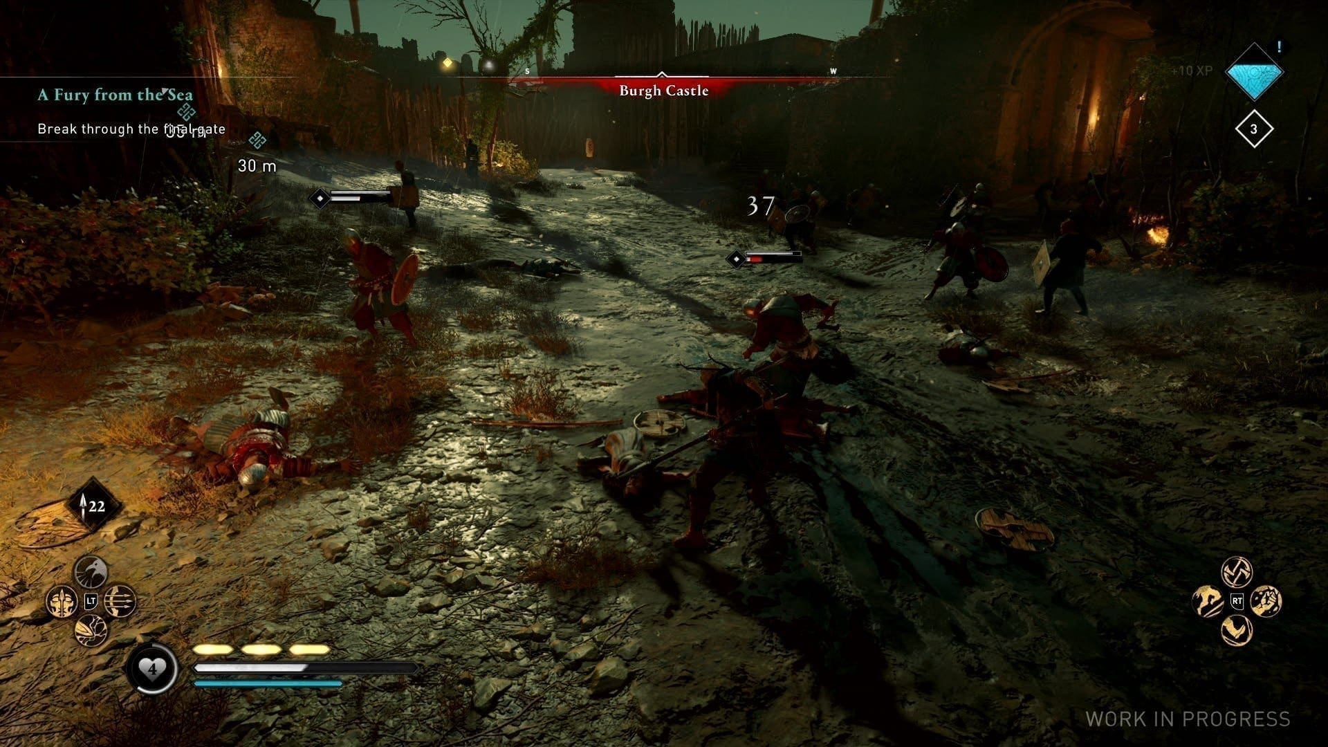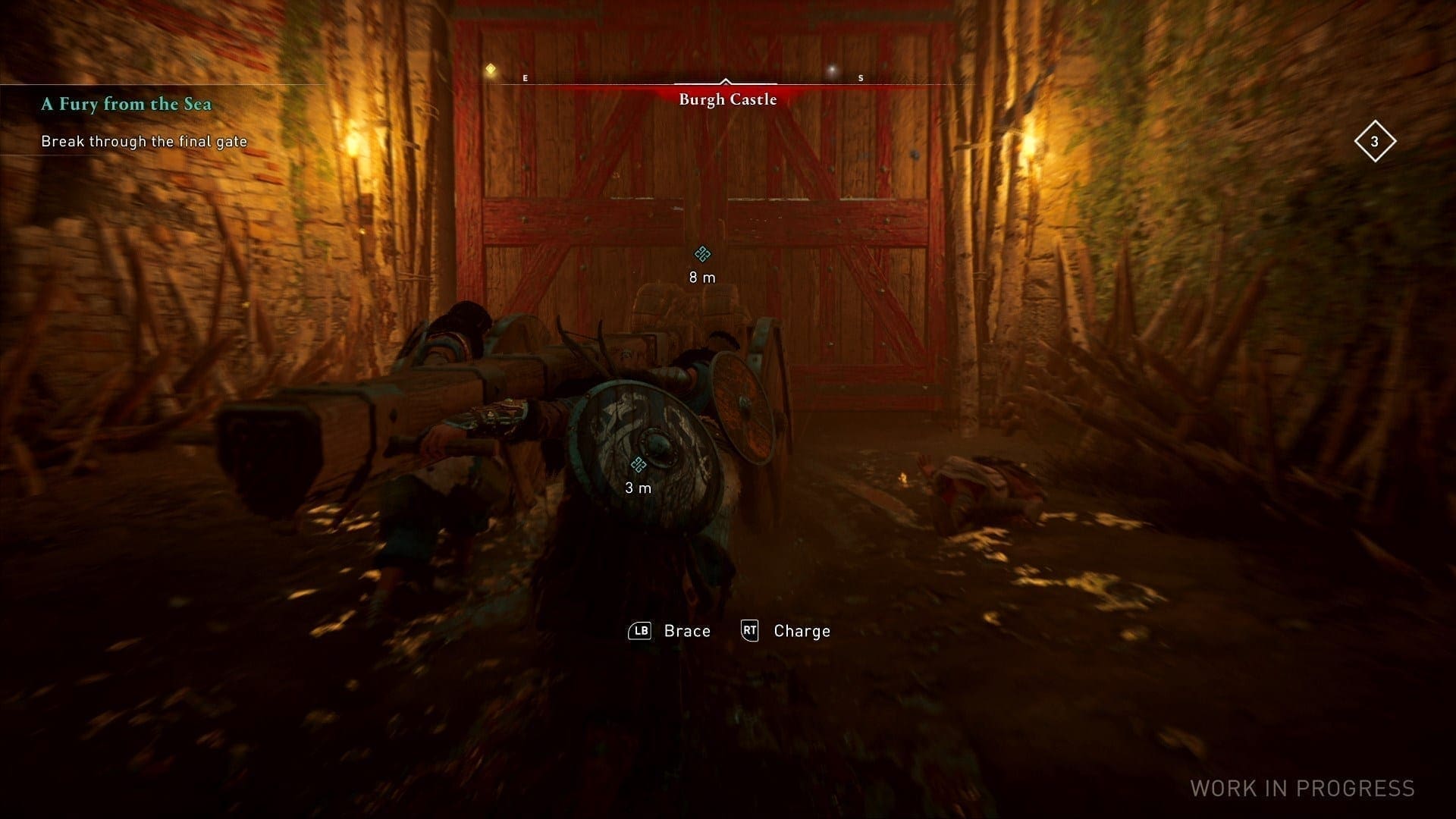 Natürlich dienen euch die Schiffe aber nicht nur als musikalischer oder erzählerischer Zeitvertreib, sondern auch als Fortbewegungs- und vor allem taktisches Mittel für Raubzüge. Also ja: Ihr könnt auf eurem Langboot in ein Horn zum Angriff blasen. Eben das habe ich in der Demo gleich mehrmals tun können – einmal in einem „kleinen“ Raid und einmal in einer großen Story-Schlacht. Vor allem letztere ließ sodann auch echtes Wikinger-Gemetzel-Feeling aufkommen. Während ich mit den zahlreichen Mitstreitern meines eigenen und anderer Clans Wall um Wall tiefer in die Festung eindrang, wurde ich mit Feuerpfeilen beschossen, unsere Ramme mit Pech übergossen und ergötzte mich regelmäßig an den kernigen Schlachtgeräuschen rund um mich herum; Schilder splitterten und wurden in purer Verzweiflung auch mal nach mir geworfen, Schwerter klirrten, Äxte spalteten Gesichter … es war ein herrliches Gemetzel. Und ein zugegeben recht unübersichtliches. Dass es in der letzten Instanz etwa nicht zwingend nötig wäre jeden einzelnen Fußsoldaten abzumurksen, bevor man sich dem eigentlich Boss stellt, war mir bis zum ungefähr achten Anlauf auf die Mission nicht klar. Ich bin gespannt, ob das im fertigen Spiel dann auch noch so regelmäßig passiert – immerhin war das in den Vorgängern ja auch gerne mal der Fall.