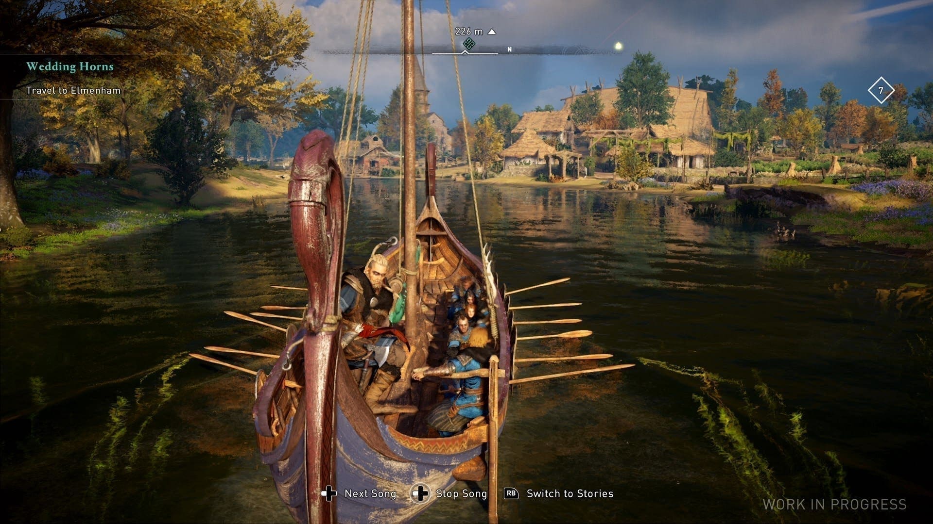 Eine weitere meiner Wikinger-Fan-Fantasien, die AC: Valhalla gut erfüllen konnte war eine Fahrt in einem Wikinger-Schiff. Dieses könnt ihr über das Tätigkeitsrad jederzeit herbeirufen (wenn ihr in der nähe eines Gewässer seid, versteht sich). Dann einfach draufklettern, zum Heck laufen und per Knopfdruck das Kommando übernehmen. Nettes Detail: So wie bei den Radiostationen etwa in GTA, könnt ihr hier zwischen Musik und Geschichten umschalten; also entweder netten Klängen lauschen oder euch eben von einem eurer Mitstreiter Schlachtanekdoten oder andere Lagerfeuer-Geschichten erzählen lassen. Witzig.