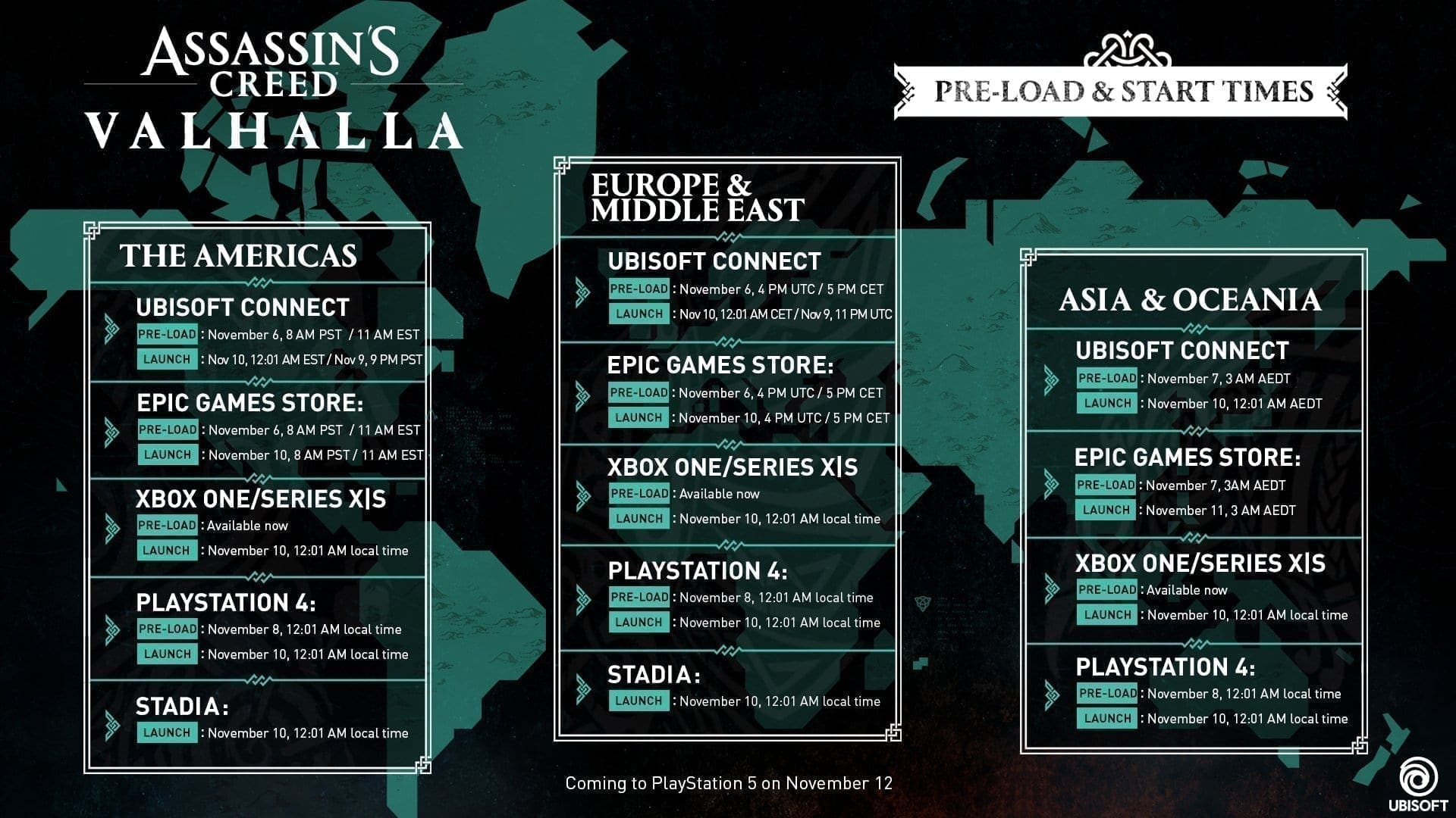 Nur noch vier Tage bis Assassin’s Creed Valhalla, der neueste Eintrag in Ubisofts 2007 gestartete Action-Adventure-Serie, am 10. November erscheint. Zur Vorbereitung auf den baldigen Release hat Ubisoft nun einen Plan mit den Pre-Load- und Launch-Terminen für die unterschiedlichsten Plattformen veröffentlicht.