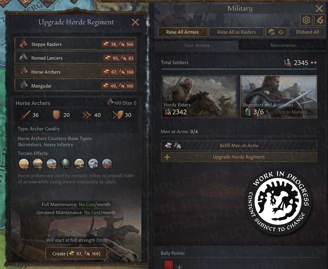 Nomaden setzen auf Steppenreiter, die sich aus einem vordefinierten Anteil der Herde herausbilden und zunächst keine Unterhaltskosten verursachen. Über Faktoren wie erweiterbare Jurtensiedlungen, Dynastie- oder Charakterboni können mehr Einheiten eingezogen werden. Verbesserungen der Reiter werden monatlich Prestige kosten. - Migration und Landnutzung: