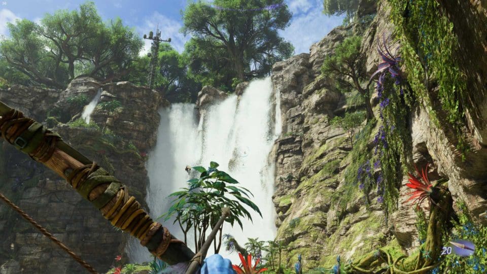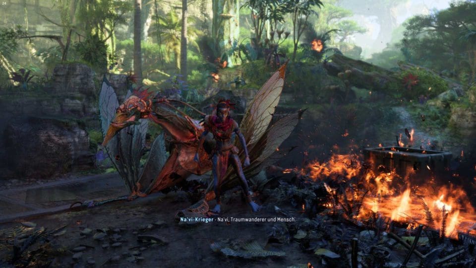 Heuer sind bereits einige grafisch umwerfende Titel erschienen – und Avatar: Frontiers of Pandora mischt hier ganz vorne mit. Man kann zu AAA stehen wie man will, aber es macht schon einen Unterschied ob die Grafik eines Spieles von ein paar Leuten oder von hunderten professionellen Grafikern erstellt wird. Ich habe noch nie ein Spiel gezockt, bei dem ich so sehr das Gefühl hatte, wirklich in einem Dschungel unterwegs zu sein. Die Dichte an Vegetation, die vielen verschiedenen Pflanzen und Tiere, die ganzen Animationen, die Hintergrundsounds… erstklassig. Leider hat die tolle Grafik auch ihre Nachteile – man sieht nämlich Vieles nicht mehr so einfach. Findet mal etwas, das irgendwo im Dschungel herumliegt. Die extrem realistische Grafik macht es schwerer, die für das Spiel wesentlichen Dinge zu entdecken, selbst die Orientierung in den offenen Spielumgebungen ist nicht mehr so einfach wie noch vor ein paar Jahren bei den klassischen Shootern. Klettere ich auf diesen Baum? Geht der Weg hinter dem Busch weiter? Was ist hinter diesem Felsen? Die Sichtweite ist, wie ich richtigen Leben, durch die ganzen Objekte stark eingeschränkt.