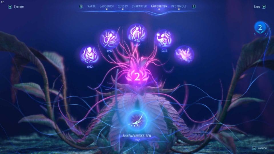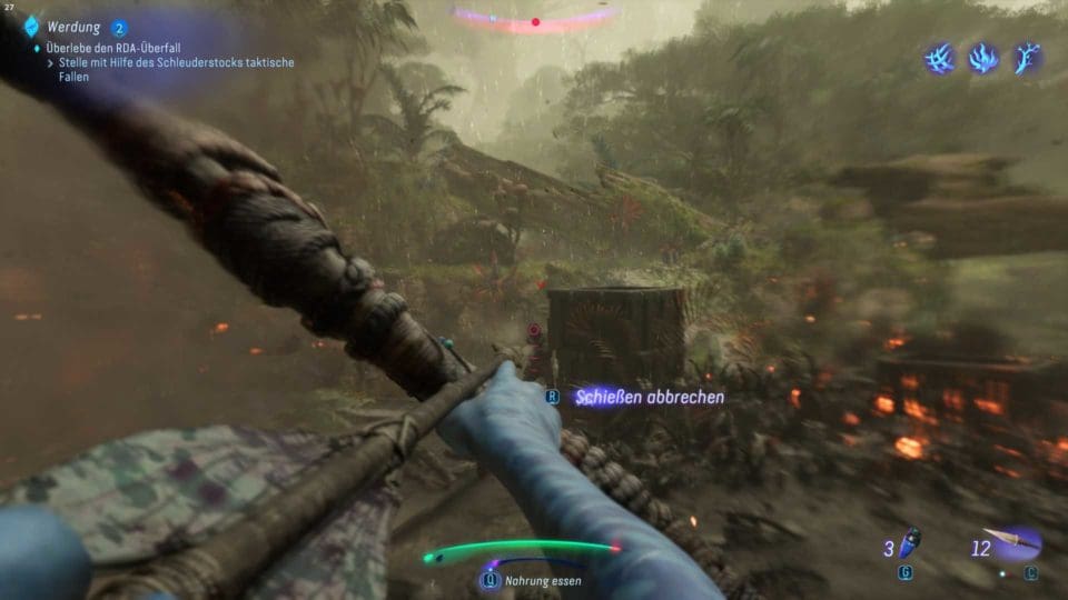 Als Na’Vi sind wir den Menschen körperlich weit überlegen. Wir sind größer als die Menschen, laufen schneller, klettern geschmeidig auf Bäume, und wir können die Tierwelt auf Pandora nutzen, um die technische Überlegenheit der Menschen zu neutralisieren. Wir reiten auf einheimischen Direhorses, wir fliegen mit unserer Banshee durch die Lüfte. Durch unsere Ausbildung bei der RDA haben wir gelernt, die Waffen der Menschen zu nutzen. Die Panzerfaust oder Schrotflinte sind Optionen, aber als Na’Vi können wir auch mit dem traditionellen Bogen (es gibt unzählige Varianten) und Speer umgehen. Schon bald lernen wir Ausrüstung selbst herzustellen und zu verbessern. Dazu benutzen wir spezielle Tische, das hat mich beispielsweise an The Last of Us erinnert. Wenn wir dazu nicht in der Lage sind, können wir natürlich neue Waffen und Ausrüstungsgegenstände auch einfach kaufen. Auch unseren Charakter können wir im Laufe des Spieles immer weiter verbessern, dazu stehen uns fünf umfangreiche Fertigkeitenbäume zur Verfügung. Auch unsere Ausrüstung verbessert unsere Charakterwerte. An Kopf, Brust, Arm, Taille und Knöchel können unterschiedliche Ausrüstungsgegenstände getragen werden. Welche Kriegsbemalung wir tragen hat jedoch keine Auswirkungen auf unsere Fähigkeiten.