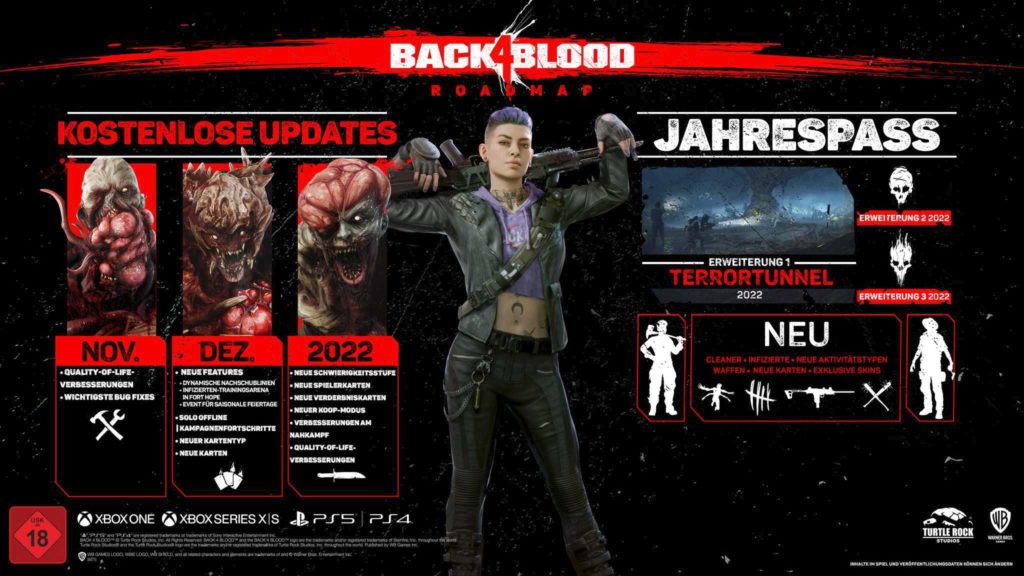 Warner Bros. Games und Turtle Rock Studios veröffentlichen heute eine Roadmap für zukünftige Inhalte von Back 4 Blood, die im Verlauf des Jahres und der nahen Zukunft erhältlich sein werden, sowie Details zu kostenlosen Updates und dem Jahrespass bietet.
