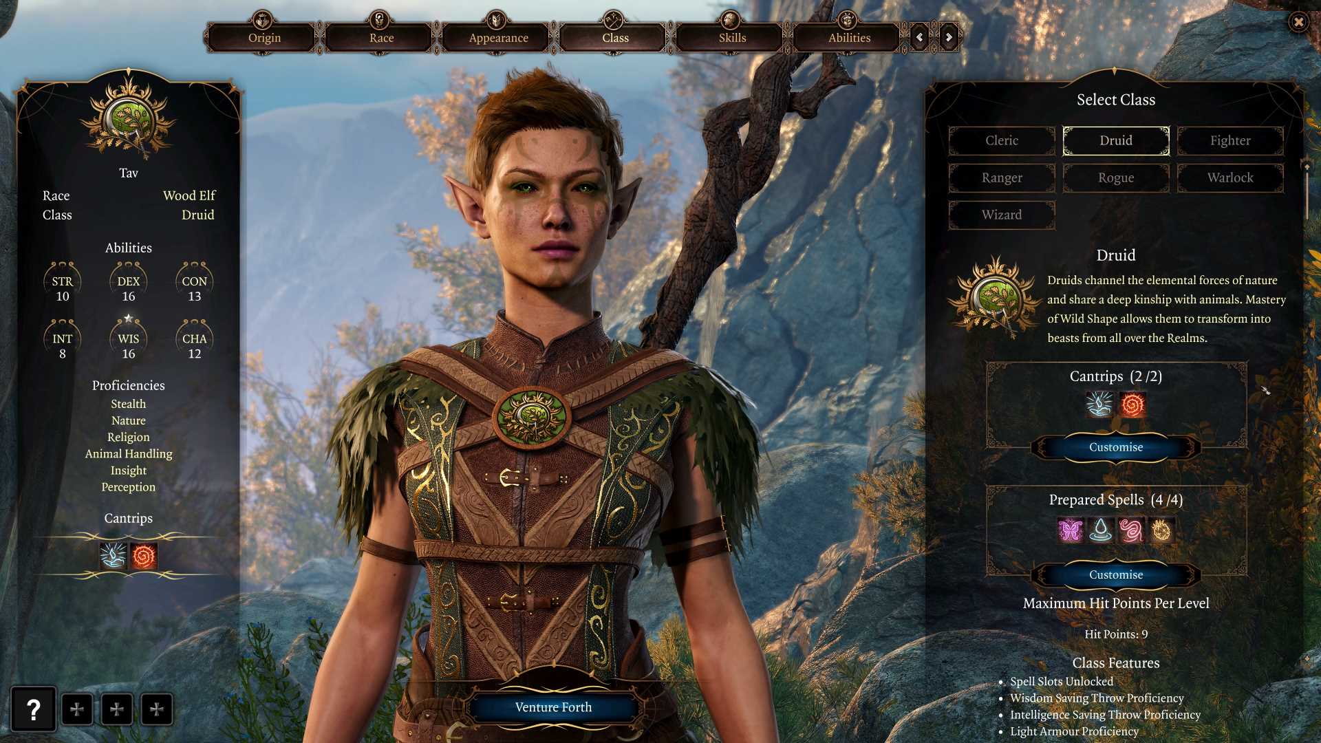 Mit der Kraft der Wildnis im Rücken können Druiden ihre Gestalt verändern, um sich an verschiedene Spielsituationen anzupassen. Spieler können in eine von acht verschiedenen Formen schlüpfen um zum Beispiel als Eisbär die Knochen ihrer Gegner zu zerschmettern, als Katze unbemerkt an Feinden vorbeizuschleichen oder als Rabe durch die Lüfte Faeruns zu fliegen. Ebenfalls ist es möglich sich vorübergehend auf die Illithid Tadpole einzulassen, die dem Spieler vom Gedankenschinder eingepflanzt wurde, um so eine neue, geheimnisvolle Abartige Form anzunehmen.
