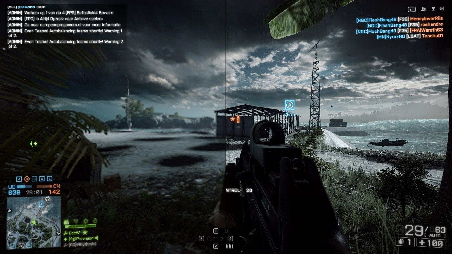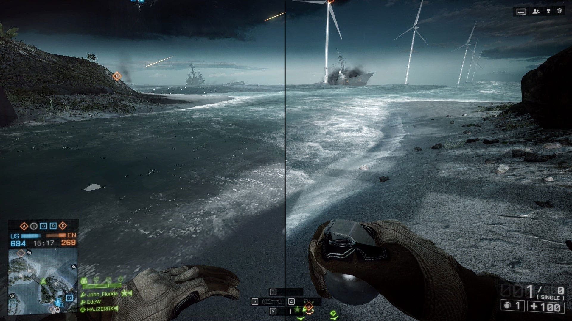 Die neuen Maps sind stärker, als beim Vorgänger, auf Fahrzeuge ausgelegt. Da sind wieder alte Bekannte dabei, wie Panzer, Jeeps, Jets und Helis, aber diesmal liegt ein großes Augenmerk auf Seeschlachten. Ja, richtig gelesen, in Battlefield 4 wird das kühle Nass als Schlachtfeld genutzt. Damit gibt’s jetzt neben Jetskis und Schlauchbooten auch größere Fahrzeuge wie das RCB 90 Angriffsboot. Das spielt sich wie ein schwimmender Panzer mit seiner 25mm Autokanone und hat ähnliche Upgradebäume wie Panzer an Land. Bei Schlachten auf See kommt auch eine neue Technik zum Einsatz namens „Networked Water Simulation“. Vereinfacht gesagt: Jeder Spieler sieht dieselbe Welle am selben Ort zur selben Zeit. Damit bietet rauer Seegang mit hohen Wellenberge eine neue taktische Komponente, Stichwort: Versteckspielen. Damit bei einem Abschuss weit weg vom Land nicht die halbe Mannschaft zum Ufer paddeln muss, kann jetzt auch bequem jeder Insasse aus dem Heck per Jetski abhauen. Eine gute Idee, wie wir finden.