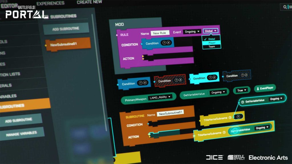 Battlefield Portal bietet eine umfassende Entwicklersuite mit Einstellungen, eigenen Modi und einem Logik-Editor. Damit erstellen, teilen und erleben Spielende unerwartete Schlachten und nutzen dabei alle Waffen, Fahrzeuge und Ausrüstungsobjekte aus Battlefield 2042 sowie einige legendäre Karten aus Battlefield 1942, Battlefield Bad Company 2 und Battlefield 3.