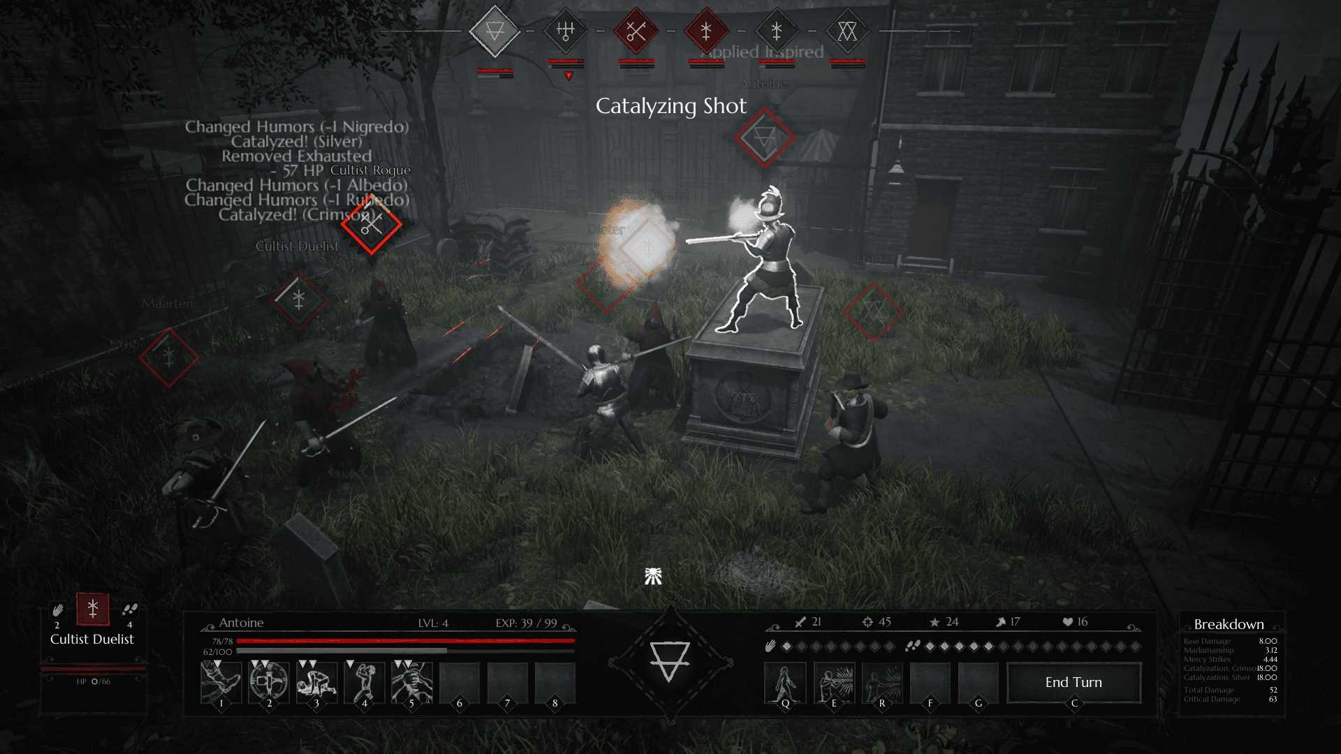Die korrekte Manipulation der vier Körpersäfte (Nigredo, Rubedo, Albedo und Citrinitas) mit den vier Katalysatoren fügt dem Ziel deutlich erhöhten Schaden zu. Klingt kompliziert, ist es auch. Aber in der Praxis ist es dann trotzdem ganz verständlich. Also keine Magie, sondern reine Naturwissenschaft. Vereinfacht gesagt könnt ihr so bestimmte Buffs für eure Helden erzeugen.