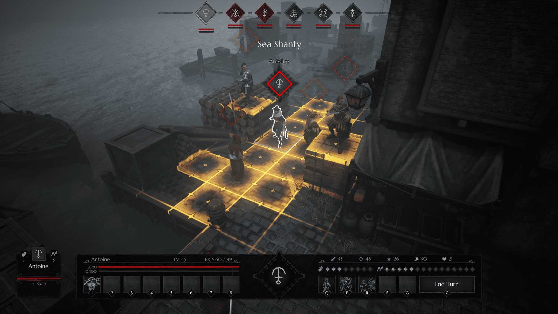Einheiten mit einem höheren Agilitätswert können sich weiter fortbewegen. Jede Einheit verfügt über (normalerweise) drei Aktionspunkte, um Angriffe oder spezielle Handlungen durchzuführen. Aktionen und Bewegungen können austauschbar verwendet werden, es gibt keine feste Reihenfolge. Das heißt, ihr könnt euch bewegen, ein Ziel angreifen, euch wieder bewegen und dann eine Aktion in beliebiger Reihenfolge durchführen. Der Einsatz von verbrauchbaren Gegenständen (beispielsweise Tränke) benötigt keine Aktionspunkte, kann aber nur einmal pro Kampf angewandt werden. Das Loslösen vom Feind ist möglich, ohne das euch dieser zum Abschied noch einmal in den Rücken sticht. Somit könnt ihr, sofern euch nicht jemand im Weg steht, Feinde regelmäßig von hinten attackieren. Eine Overwatch Funktion, um außerhalb der Zugreihenfolge automatisch anzugreifen, ist nicht vorhanden.