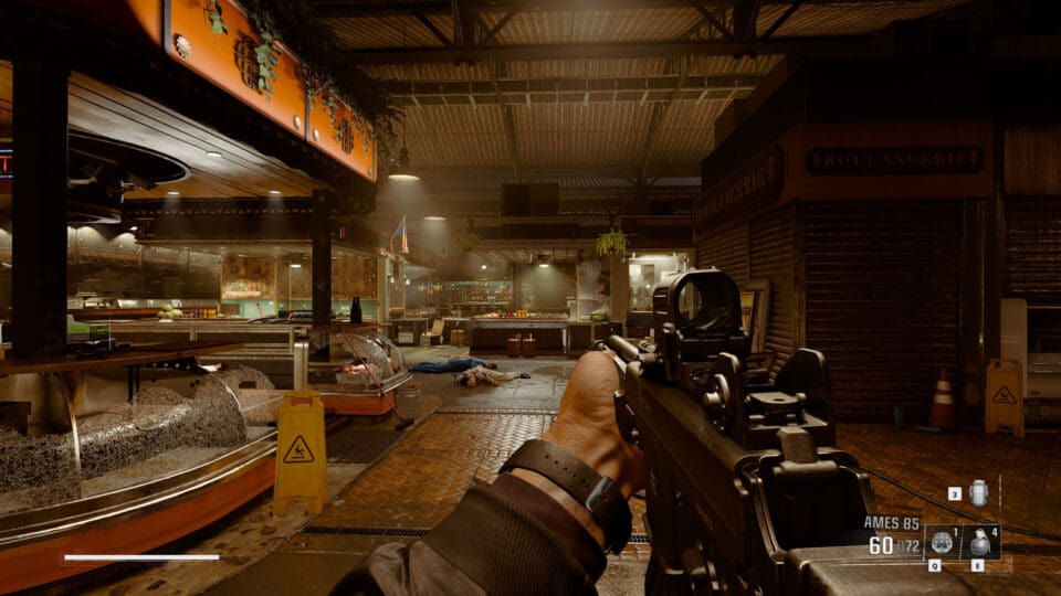 Das ist nicht Call of Duty wie ich es kenne. Allerdings ist es auch nicht schlecht, nur vollkommen unerwartet. Wir bewaffnen uns mit einer schallgedämpften Pistole, Wurfmessern, einem Baseballschläger, Betäubungsfallen und dürfen von unseren Gegnern nicht entdeckt werden, sonst ist die Mission gescheitert. Wenn uns Gegner doch entdecken, können wir sie aber immer noch schnell im Nahkampf ausschalten. Solange uns dabei niemand beobachtet, endet die Mission nicht. An die Qualität eines Hitman kommen die Schleich-Passagen aber natürlich nicht heran. In den meisten Missionen dauern sie auch nicht lange, sondern es kommt bald die Information, dass es von nun an egal ist, wie wir weiter machen – weiterhin unauffällig oder indem wir einfach wie Rambo alle Gegner abknallen. Und nachdem ich meistens von jemand entdeckt werde, habe ich die Missionen dann wie in einem Shooter üblich beendet. Die Gegner verhalten sich nicht sonderlich klug, sondern stürmen oft direkt auf meinen vermuteten Aufenthaltsort zu, sodass sich bald Berge von Leichen vor von mir verteidigten Positionen befinden. Der Mafiaboss am Ende einer anderen Mission hat sich fast wie ein typischer Bossgegner gespielt, der Typ hat einige Treffer und Handgranaten ausgehalten und ist dann immer noch weggelaufen… Solche und ähnliche immer wieder vorkommende Aufträge haben sich einfach nicht wie ein typisches Call of Duty angefühlt. Der Elitesoldat von Pantheon hat beispielsweise ausgesehen wir direkt aus Wolfenstein: The New Order.