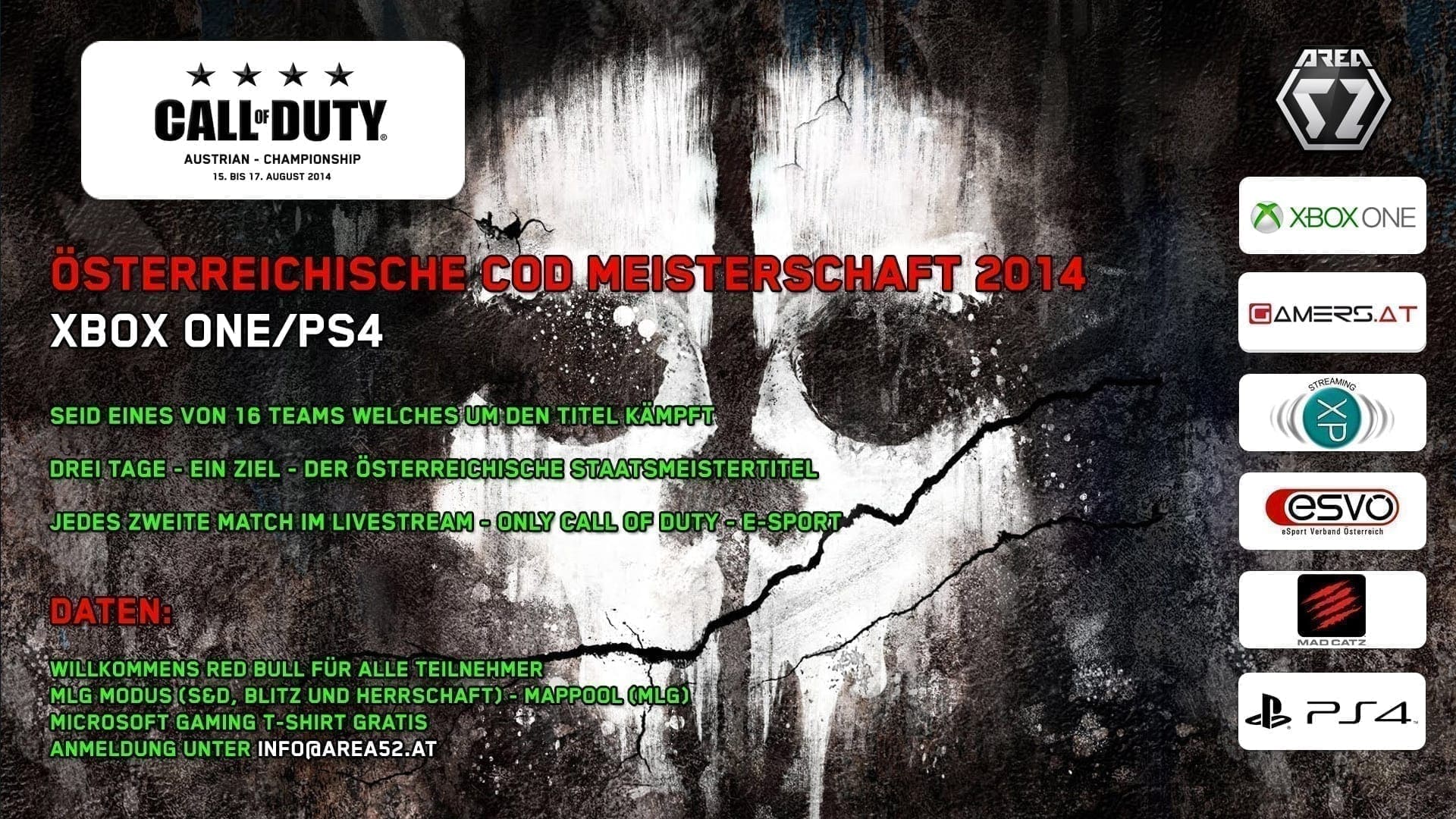 Gespielt wird die Call of Duty Austrian Championship im August, vom 15.08.2014 bis 17.08.2014, in Wiens bester Gaming Lounge der AREA52. Dank der Unterstützung von Microsoft Österreich kann die Championship auf der Xbox One stattfinden und sämtliche Matches im Livestream verfolgt werden. Durch den großen Andrang bei der Call of Duty Osterchallenge wird auch auf der PS3 um den Titel gekämpft. Ein Willkommens Red Bull sorgt für die geistige Frische, bei drei actionreichen Tagen könnt ihr das auch brauchen.
