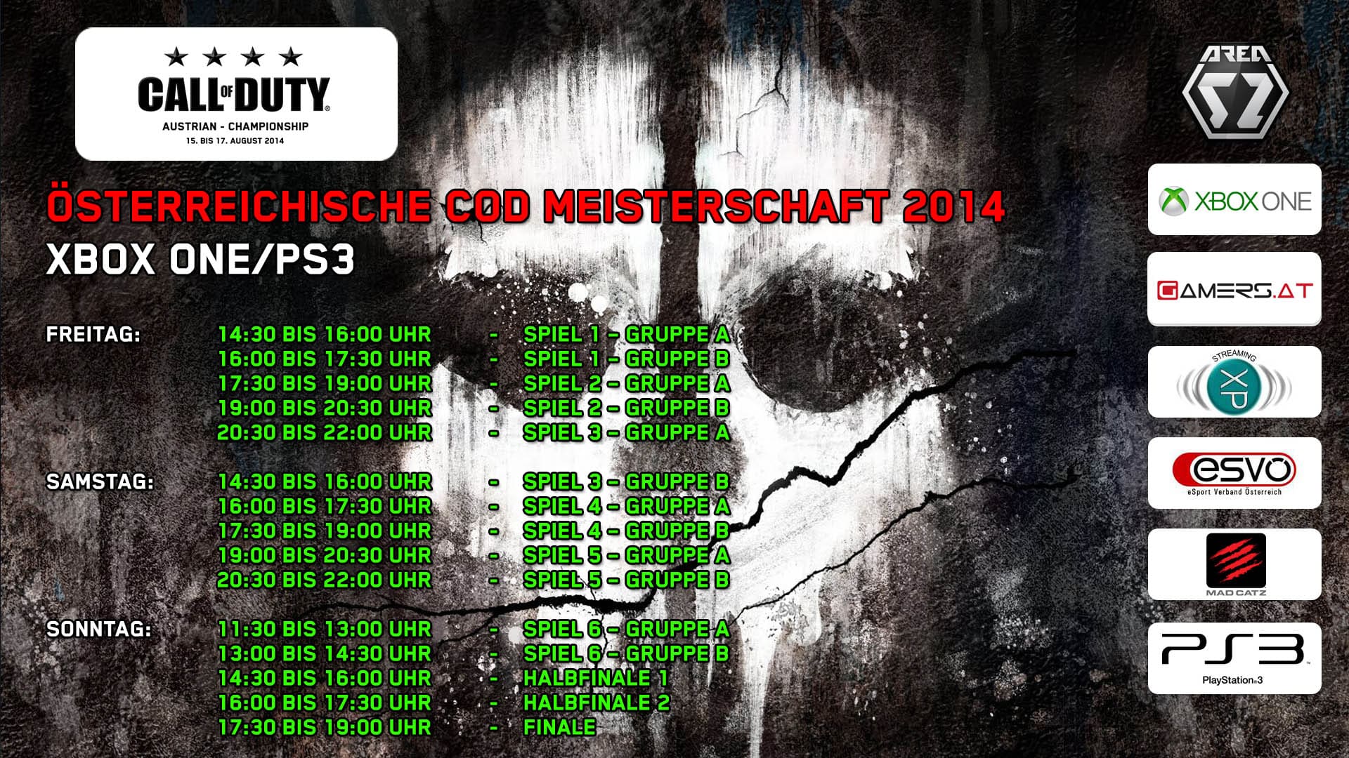 Gespielt wird die Call of Duty Austrian Championship im August, vom 15.08.2014 bis 17.08.2014, in Wiens bester Gaming Lounge der AREA52. Dank der Unterstützung von Microsoft Österreich kann die Championship auf der Xbox One stattfinden und sämtliche Matches im Livestream verfolgt werden. Durch den großen Andrang bei der Call of Duty Osterchallenge wird auch auf der PS3 um den Titel gekämpft. Ein Willkommens Red Bull sorgt für die geistige Frische, bei drei actionreichen Tagen könnt ihr das auch brauchen.