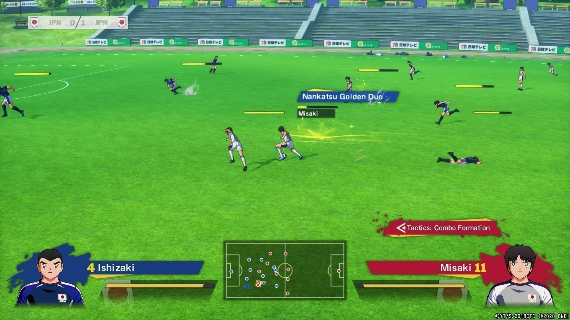 Konterkariert wird das Teamspiel wiederum durch den Kameraausschnitt. Selbst der weiteste Kamerawinkel auf das Spielfeld fällt zu nahe am Geschehen aus, um die Übersicht zu wahren. Anders als in anderen Genreablegern wird mir in Captain Tsubasa: Rise of New Champions zu allem Überdruss durch keine Indikatoren am Bildschirmrand angezeigt, wo sich ungefähr der nächstgelegene Mitspieler aufhält. Lediglich eine kleine Minimap am unteren Bildschirmrand lässt mich erahnen, wo sich meine Kollegen gerade umtreiben. Blicke auf dieselbe werden jedoch nicht selten mit dem Ballverlust bestraft, da mir mit Vorliebe genau in diesen Momenten ein gegnerischer Spieler dazwischen grätscht.