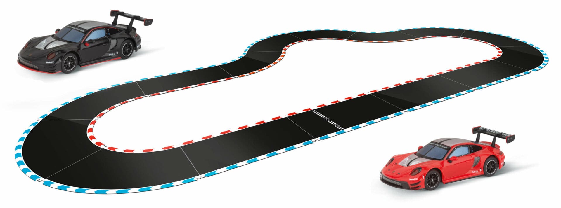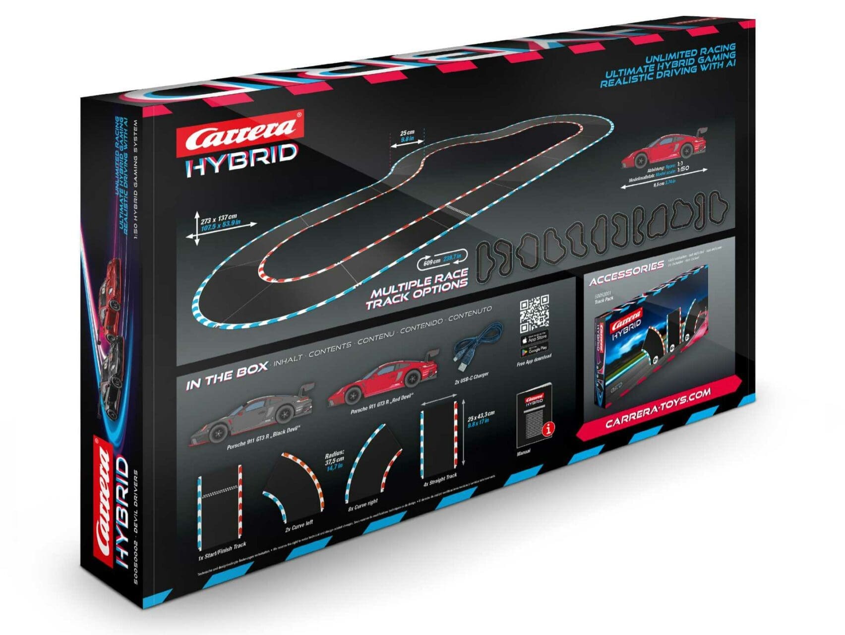 Als unser Testsystem fungierte das Carrera Hybrid – Devil Drivers Set, welches Streckenteile für die Länge von 6,09 Metern enthält, die es erlauben verschiedene Kurse aufzubauen. Die Kombination aus einer Start-/Zielgeraden, vier geraden Abschnitten sowie acht Rechts- und zwei Linkskurven ermöglichen einfachere Kurse für ein dynamisches Rennen. Als Fahrzeuge enthält das Set weiters zwei detailgetreue Porsche 911 GT3 R Modelle „Black Devil“ und „Red Devil“, damit kann nach dem Aufbau der Strecke gleich losgerast werden.