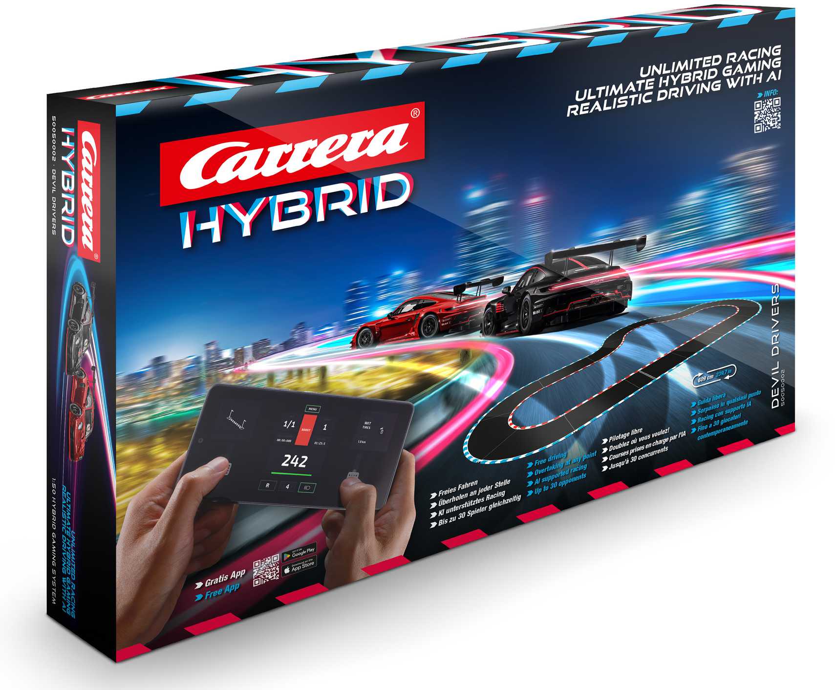 Carrera Hybrid ist ein innovatives System, das klassische Carrera Slotcar-Rennbahnsysteme mit einer digitalen Steuerungseinheit und einer zugehörigen App verbindet. Das Herzstück bildet die „Carrery Hybrid App“, die als Schnittstelle zwischen der physischen Bahn und der digitalen Welt fungiert. Sie ermöglicht eine erweiterte Steuerung der Fahrzeuge, personalisierte Fahrerprofile, spannende Rennmodi und detaillierte Statistiken. Die Fahrzeuge bewegen sich also beim Rennen nicht mehr auf festen Schienen, sondern nutzen künstliche Intelligenz und optische Sensoren, um selbstständig die Fahrbahn zu erkennen und zu befahren.