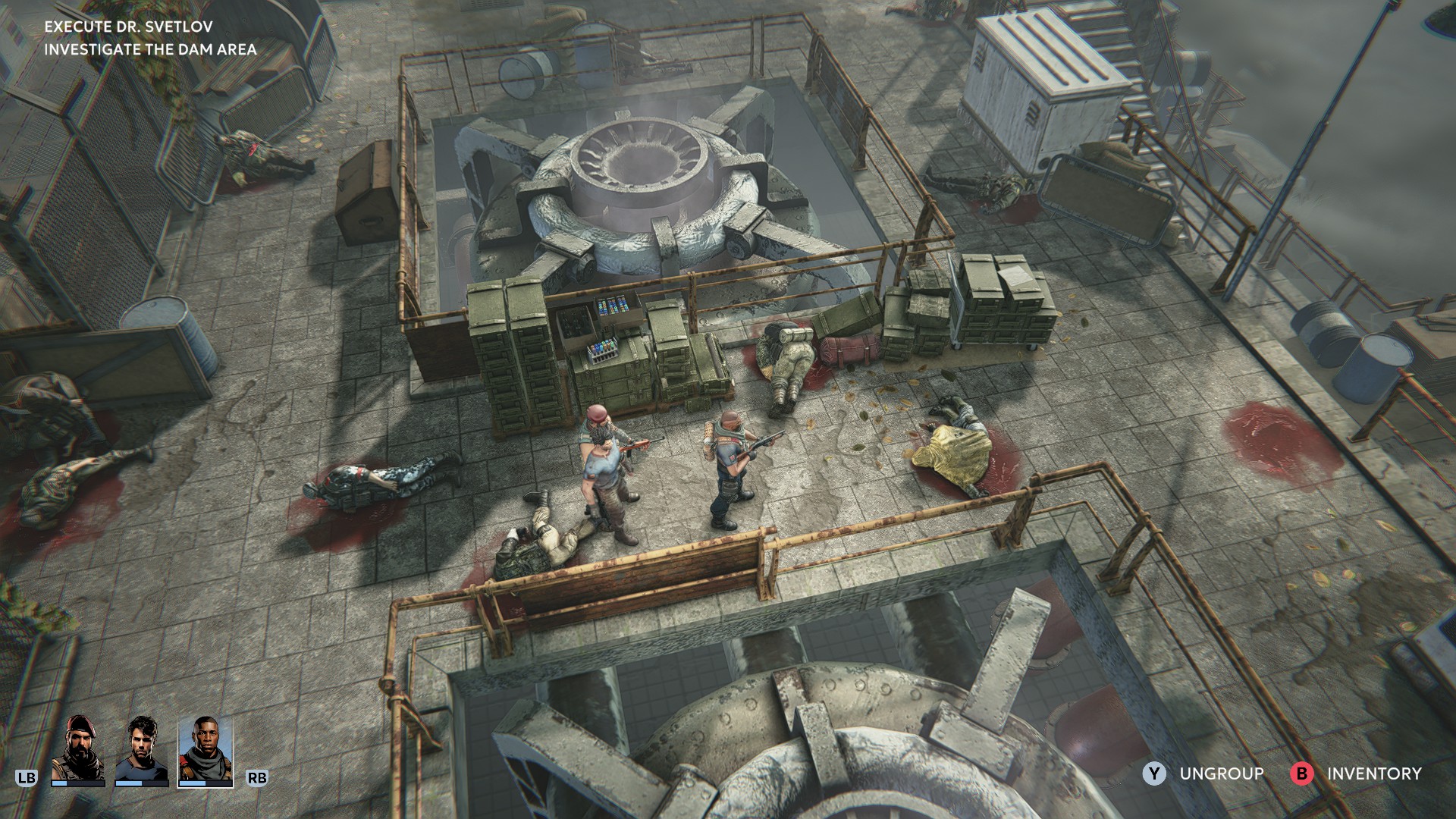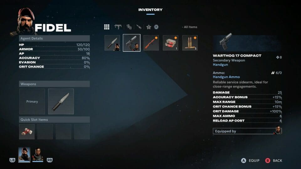 Ihr habt ein gemeinsames Inventar, wo ihr euren Soldaten eine primäre (Gewehr, Schrotflinte, Armbrust…) und sekundäre Waffe (Pistole, Messer, Golfschläger…) zuweisen könnt. Dazu kommen ein paar wenige Slots für weitere Ausrüstung (Granaten, Heilmittel). Findet ihr Panzerplatten, könnt ihr diese anlegen, wodurch bei Treffern zuerst die Panzerung reduziert wird, bevor eure Männer Schaden nehmen. Leider begegnen euch auch sehr bald viele schwer gepanzerte Gegner. In einem weiteren Menü könnt ihr Gegenstände herstellen. Munition für die verschiedenen Feuerwaffen (Schrot, Gewehr, Pistole, Armbrust), Bandagen oder Handgranaten – allerdings benötigt ihr dafür natürlich die entsprechenden Zutaten, die ihr zuvor in der Gegend finden müsst. Diese Ressourcen sind dummerweise immer recht knapp bemessen.