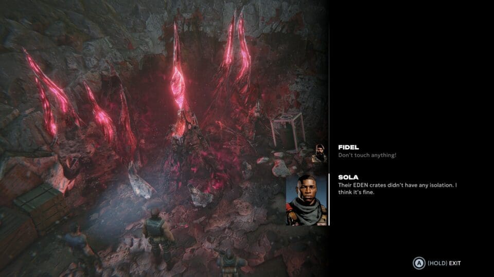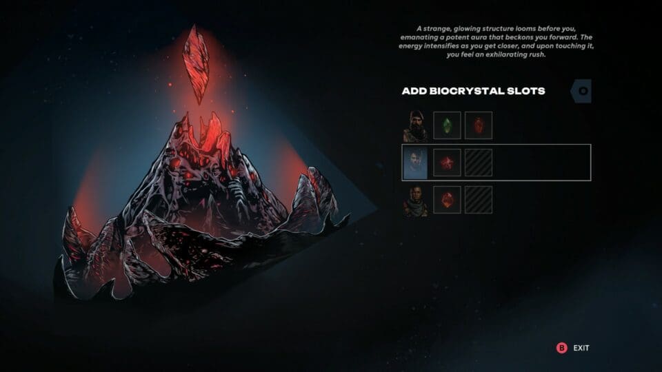 Und dann gibt es noch einen dritten Punkt – die Bio-Kristalle. Ihr findet im Spiel sehr bald verschiedene Kristalle, die sich seit dem Meteoreinschlag auf der Welt ausbreiten. Ihr seit grundsätzlich gegen die tödlichen Auswirkungen des Meteors immun (weil geimpft), aber durch die Kristalle könnt ihr euren Leuten zusätzliche Fähigkeiten (aktiv oder passiv) geben. Jeder Soldat hat eine bestimmte Anzahl von freien Slots, wo ihr die gefundenen Kristalle einsetzen könnt. Ihr habt bald eine beträchtliche Auswahl an Kristallen zur Auswahl, und findet auch immer wieder Orte, an denen ihr zusätzliche Slots für eure Soldaten freischalten könnt. Dieser Upgradebaum für eure einzelnen Teammitglieder erlaubt euch eine weitere Individualisierung eurer Männer (die ohnehin bereits von Anfang an alle ein wenig unterschiedlich sind).