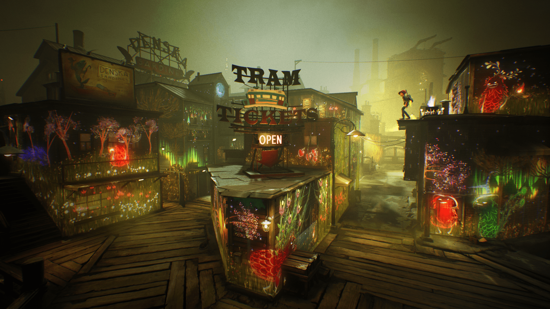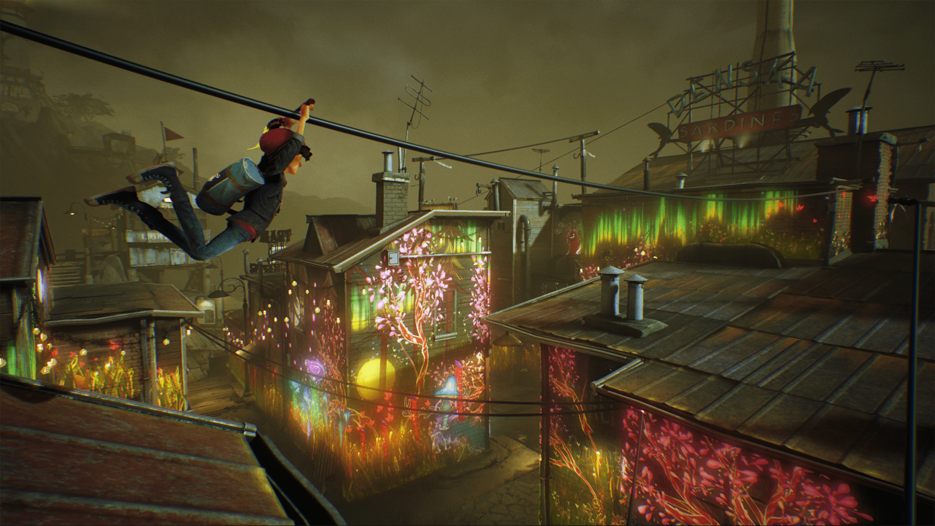 So wunderbar entspannend das Malen in Concrete Genie auch ist, so ganz ohne aktive Widersacher dürft ihr euch dem Farbenspiel dann aber doch nicht hingeben: Während eurer Malereien begegnet ihr immer wieder der durch die Straßen der Stadt ziehenden Bande, die es nach wie vor auf euch abgesehen hat. Der einfachste Weg, ihr zu entgehen: Ihr klettern über die Dächer von Denska. Dort oben habt ihr nicht nur einen tollen Ausblick und findet weitere Seite eures Skizzenbuches für noch mehr mögliche Malformen, oft ist der Weg in luftigen Höhen auch der einzige, um in neue Bereiche des Ortes zu gelangen und auch dort zu malen und alle Glühbirnen zum Leuchten zu bringen.