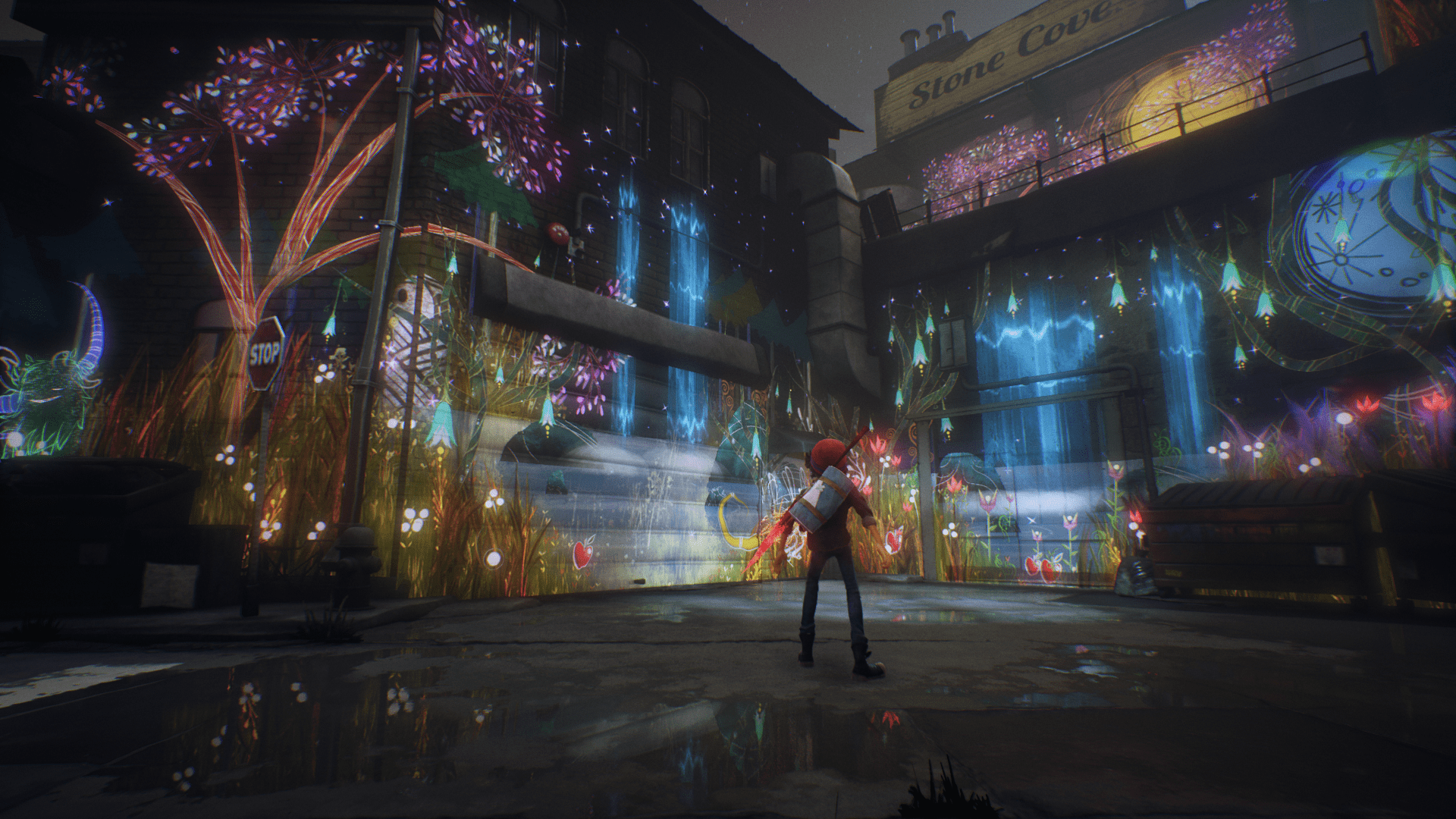 Die Formen erhaltet ihr dabei, indem ihr Seiten, die in den Straßen herumwirbeln, findet, während ihr bei all dem stets von euren gemalten und zum Leben erweckten Dschinns begleitet werdet. Diese kommen in mehreren Varianten, wie Feuer, Elektrizität oder Wind, und helfen euch auf mehrere Weise: Zum einen sagen sie euch immer wieder, welche Formen sie gerne an entsprechenden Wänden sehen würden und belohnen euch für das jeweilige Kunstwerk mit Superfarbe, die auch über Wände malen kann, die von den violetten Strängen der Dunkelheit überwuchert sind. Zum anderen können Dschinns aber auch Barrieren wegbrennen, Stromkästen und somit diverse Maschinen aktivieren, oder ganze Trucks wegpusten.