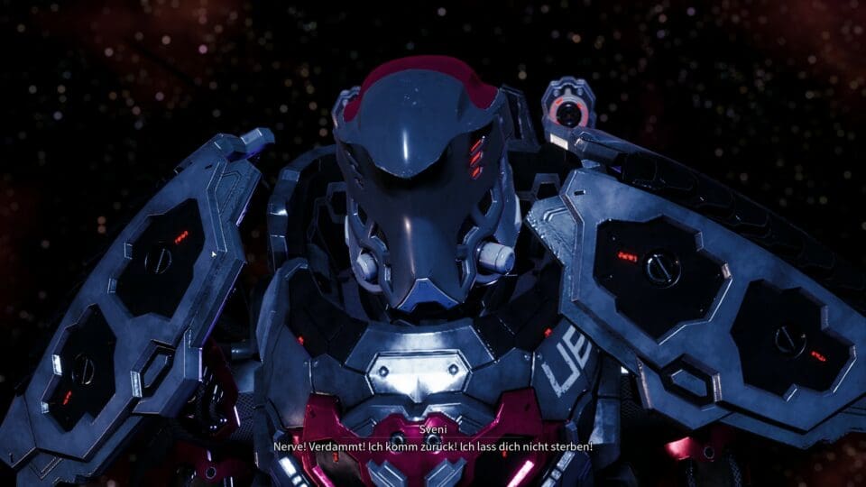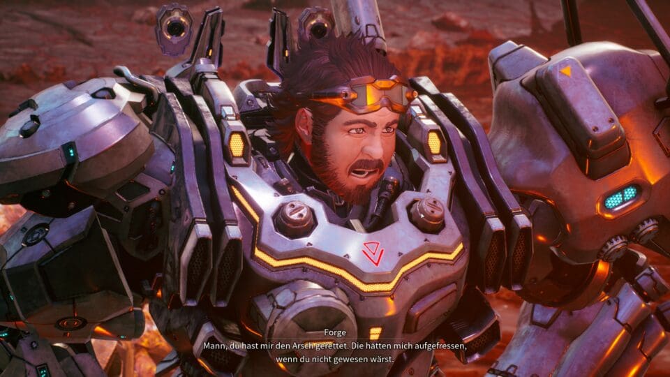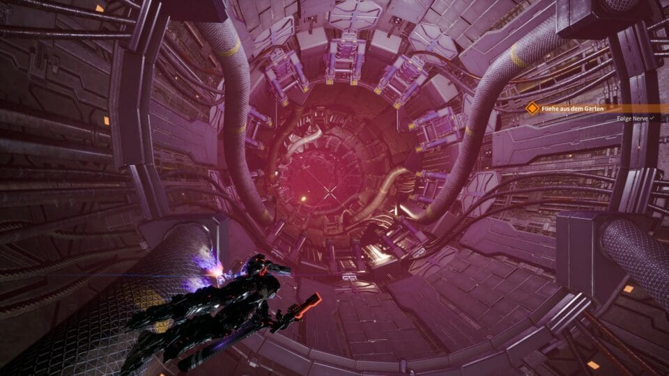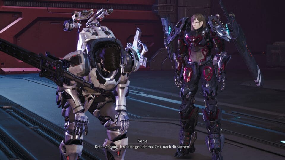 Was unterscheidet Daemon X Machina: Titanic Scion von vielen der anderen Mecha-Spiele? Ihr lauft nicht in einem gigantischen Mech durch die Landschaft und zerdrückt die Bäume unter euch, sondern spielt in einem eher kleinen Mech-Anzug (quasi eine moderne Rüstung) und kämpft neben eurer Fernkampfwaffe auch mit dem Schwert. Und damit das ganze noch unrealistischer wird, fliegt euer Mech auch durch die Landschaft wie Rocket Ranger (Cinemaware, 1988), nur wesentlich wendiger. Nachdem die Gebäude in der Zukunft alle riesig sind, ist auch dass Herumfliegen in den Gängen kein Problem. Und das alles kann spielerisch durchaus Spaß machen! Ihr lauft/fliegt mit euer Mech-Rüstung durch die Gegend, beharkt Gegner mit eurer Feuerwaffe und zerschnetzelt sie im Nahkampf.