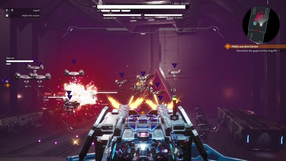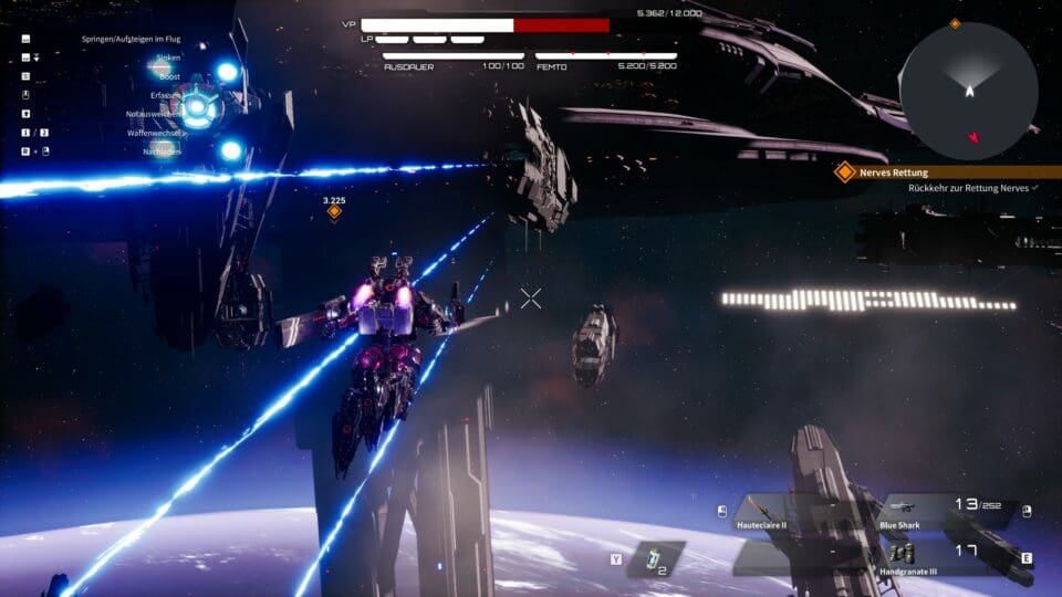 Laufen, springen, fliegen, Nahkampf- und Fernkampfwaffe einsetzen, Heilmittel und Handgranaten einsammeln – der grundsätzliche Spielablauf ist recht einfach erklärt. Mit Schulterwaffen rüstet ihr euer Arsenal weiter auf. Daemon X Machina: Titanic Scion spielt sich wie ein futuristisches, extrem schnelles Hack and Slash Spiel, bei dem ihr bei all der Hektik, Herumfliegerei und den ganzen Explosionen schnell einmal die Übersicht verlieren könnt, während schnelle Hardrock-Musik aus dem Lautsprecher erklingt.
