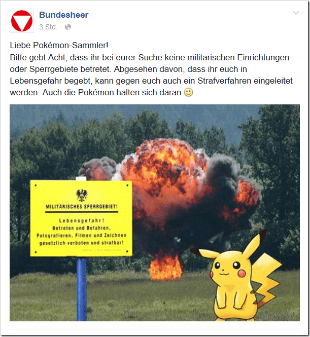Auf der offiziellen Facebook Seite hat das österreichische Bundesheer nun eine Mitteilung an alle Pokémon GO Spieler veröffentlicht. Es warnt davor, bei der virtuellen Jagd nach Pokémons militärische Einrichtungen und Sperrgebiete zu betreten.