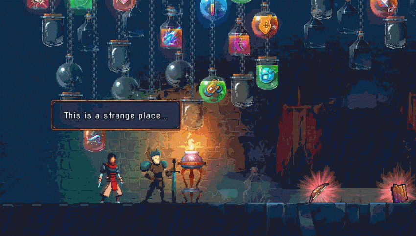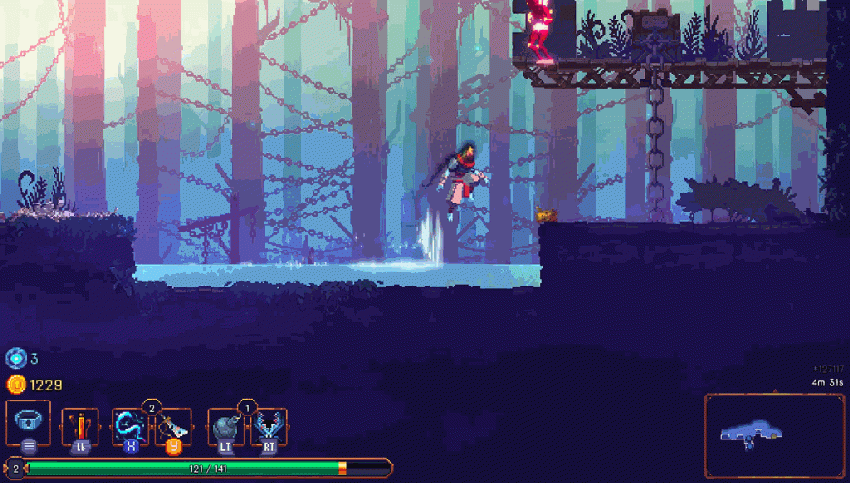 So macht man sich also auf den Weg, dieses monsterverseuchte Schloss auf der Suche nach einem Ausgang, zu erkunden. Schon nach den ersten paar Gegnern ist zu erkennen, von welchen Vorbildern sich die Macher hier inspirieren haben lassen. Wie den Dark Souls-Titeln benutzt jedes Monster seine ganz eigenen Angriffe und Schlagabfolgen. Diese gilt es sich einzuprägen und Wege zu finden, damit umzugehen. Fehler werden auch hier hart bestraft, denn schon recht frühe Gegner können einen mit nur wenigen Treffern zurück an den Start schicken. Glücklicherweise bietet uns das Spiel durch eine Vielzahl an Waffen verschiedenste Möglichkeiten an das Kampfgeschehen heranzugehen. Maximal zwei der sich zum Teil massiv unterscheidenden Nah-, Fernkampfwaffen, oder Schilde, können wir gleichzeitig ausrüsten, beziehungsweise benutzen. Dazu kommen noch zwei Slots für diverse Gadgets, wie etwa Bomben oder Bärenfallen. All diese Gegenstände sind zufällig in den Levels verteilt, genau wie Skill-Upgrades, die unsere Lebensenergie erhöhen oder unseren Kampfschaden steigern. Dasselbe gilt auch für die Feinde und den Levelaufbau selbst. Die einzige Hilfestellung, die uns das Game bietet, sind die sogenannten Cells. Die werden von getöteten Gegnern, neben Gold, fallengelassen und stellen eine Art zusätzlicher Währung dar. Diese investiert man bei speziellen NPCs, die nur zwischen zwei Leveln anzutreffen sind, um permanente Upgrades freizuschalten. Zum Beispiel kann man so die mitgeführte Heiltrankflasche öfter benutzen, Waffen und andere Gegenstände verbessern, oder einen Geldbeutel freischalten. Dieser ermöglicht es einem, nach dem Ableben zumindest einen kleinen Teil seines Vermögens, zu behalten. Ohne dieses Item geht nämlich alles Geld, genauso wie alle gesammelten Cells, verloren, wenn man stirbt.