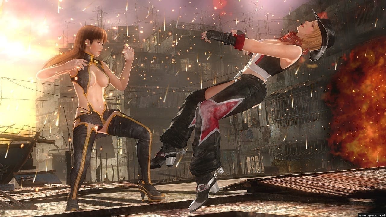 Ganz neu: Kämpfer können über die umgebende Begrenzung geworfen werden und bezahlen mit fiesen Cliffhanger-Events, die sie auf das untere Level, eine Straße, auf der nur etwas Licht durch die Leuchtreklamen fällt, verfrachten. Die Screenshots zeigen Kokoro, Brad, Leifang und Tina in den neuen sexy Kostümen und individuell angepassten Frisuren auf der The Crimson-Stage. Dabei nutzen sie die Danger Zones beider Etagen.