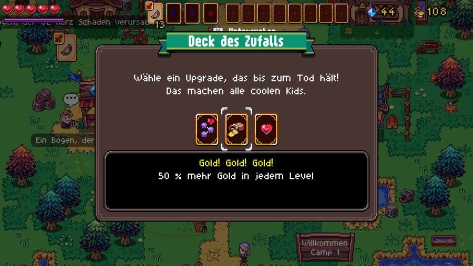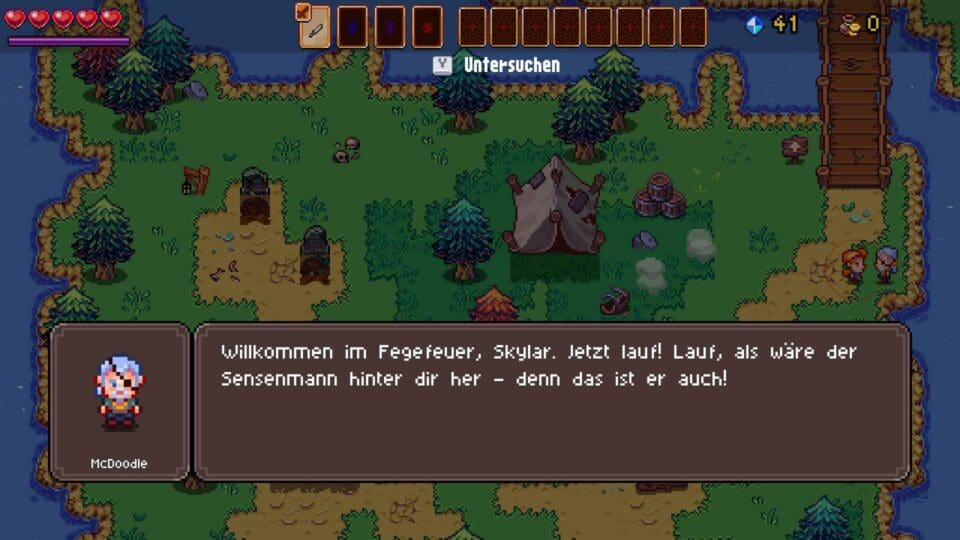In diesem kann entspannt mit NPCs geplaudert werden. Man sollte zwar nicht erschöpfende Dialoge wie aus Thimbleweed Park oder Monkey Island erwarten, dennoch bietet Death by Scrolling einige amüsante Wortwechsel. Unter anderem hat auch LucasArts-Veteran Dave Grossman einige Texte beigesteuert. Die Campbewohner dienen teilweise auch als Auftraggeber oder Händler. So lassen sich über ersammelte Diamanten dauerhafte Verbesserungen erwerben, die dann für Progression sorgen. Über Upgrades können die insgesamt fünf spiel- bzw. freischaltbaren Charaktere weiter spezialisiert werden, wobei man hier nicht die Variationsvielfalt größerer Genrevertreter erwarten sollte.