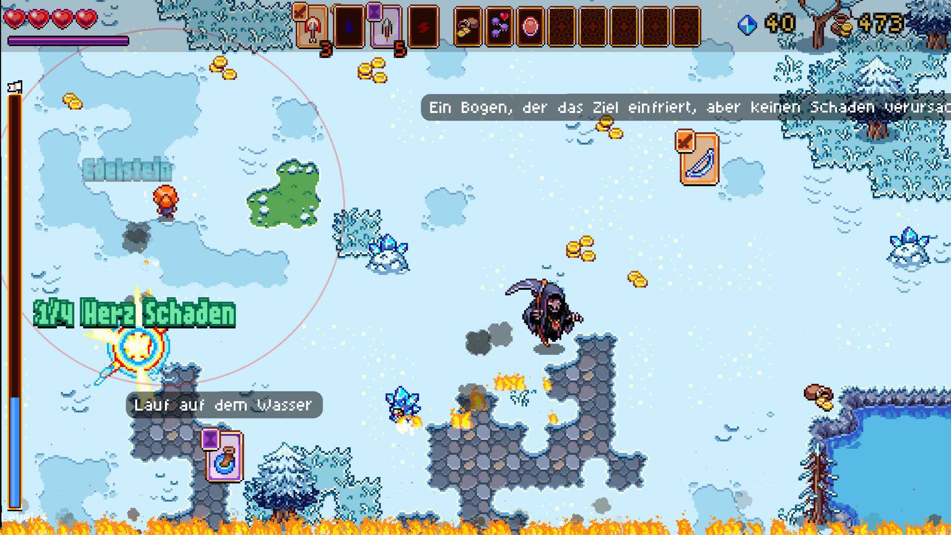 Gnadenloser ist da das Fegefeuer. Sobald ein Level beginnt, arbeitet sich dieses lodernd von unten immer weiter nach oben vor, wobei der Bildschirm sich dabei immer mitbewegt. Gerät man in die Flammen,nimmt man zunächst Schaden, recht schnell ist aber das Gameover erreicht, welches dann pflichtschuldig verkündet: Death by Scrolling (Tod durch Scrollen).