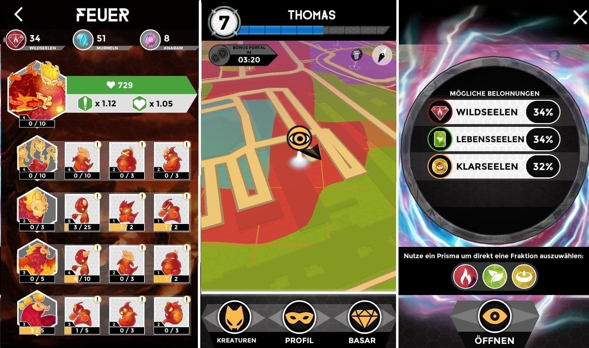 Wie in Pokémon Go ermittelt Fightlings zunächst anhand der GPS-Daten des mobilen Devices die Standortdaten des Spielers und positioniert ihn auf einer virtuellen Landkarte, wobei hier die Geodaten nicht von Google, sondern von OpenStreetMap stammen. Der große Unterschied zu Nintendos Taschenmonster-Jagd: Die Umgebung ist in verschiedenfarbige Regionen unterteilt. Stark frequentierte Verkehrsflächen sind beispielsweise rot, Wälder und Parks grün und andere sind dann wieder blau, orange oder lila. Je nach Farbe können dort dann unterschiedliche Ressourcen in Form von Seelen gesammelt werden. Obwohl das Motto von Fightlings „Go out and play!“ lautet, muss man dieses aber nicht zwingend wörtlich nehmen, denn man kann jedem Ort der Welt sammeln, egal ob draußen oder im inneren eines Gebäudes. Dieses Anhäufen an Seelen ist nun kontextsensitiv, das bedeutet, dass Faktoren der realen Welt wie etwa Zeit, Wetter die Menge und die Art der Ressourcen beeinflussen, die man einsammeln kann. Entlang einer Straße zur Rush-Hour können andere Seelen eingefangen werden, als zu einer weniger frequentierten Zeit. Auch am Spielplatz findet man bei Regen nicht die gleichen Ressourcen, wie etwa bei trockenem Wetter und wer sich zur späten Stunde und vielleicht sogar auch noch bei Vollmond auf einen Friedhof traut, der kann dort dann auch ganz etwas anderes finden als etwa bei Tag. Zusätzlich gibt es dann noch so genannte POIs (Points of Interest). Das sind besondere Orte auf der Karte, an denen es nicht nur Seelen zum sammeln gibt, sondern wo sich auch Kreaturen tummeln, die man einfangen kann. In Fightlings sind das etwa Schulen, Museen aber auch gewöhnlichere Plätze wie Haltestellen, Briefkästen oder auch Parks.