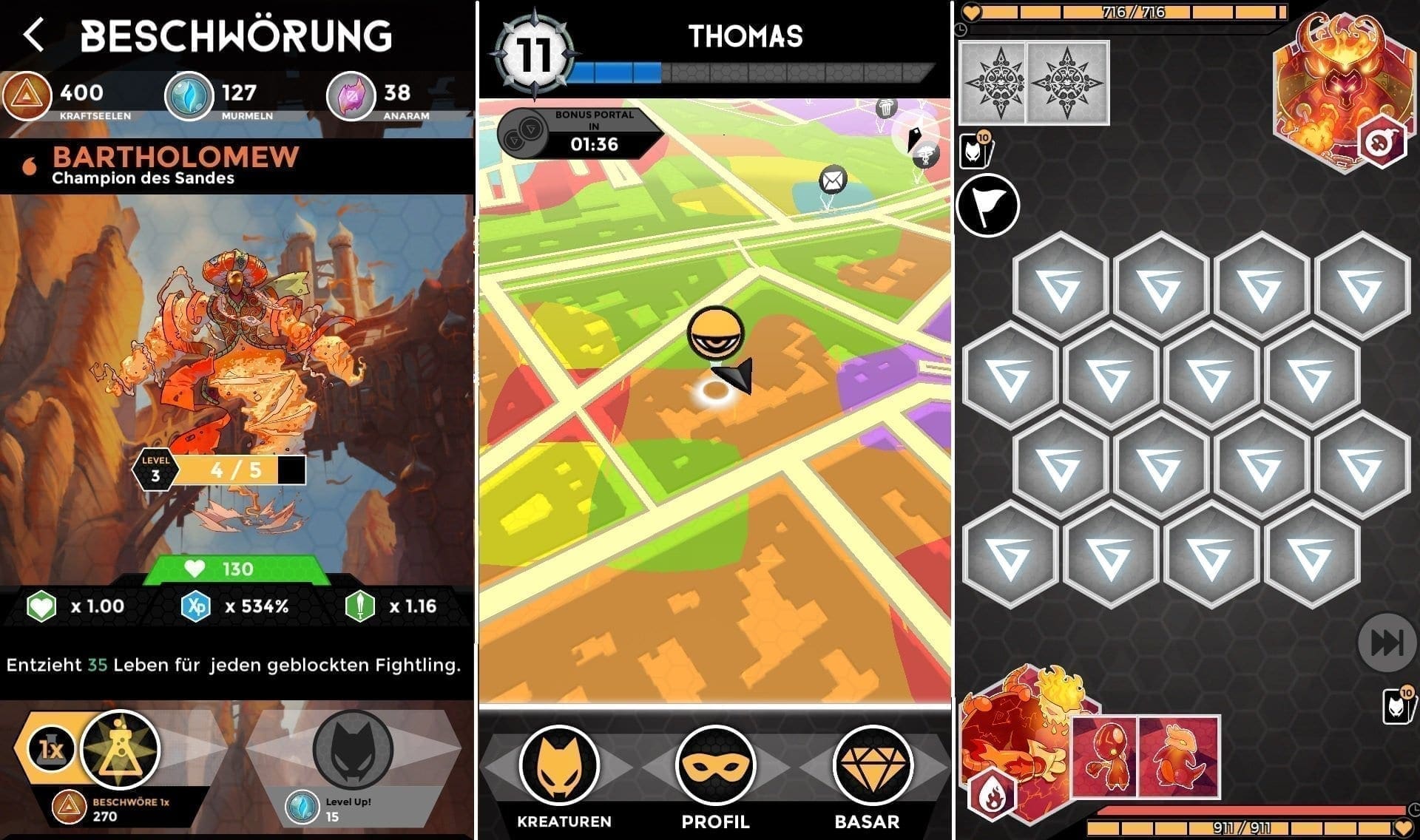 Zusätzlich zu den Seelen gibt es in Fightlings noch zwei weitere Ressourcen. Das sind zum einen Murmeln, welche man durch gewonnene Duelle bekommt oder bei einer neuen Stufe oder sie können alle paar Stunden bei einem Portal abgeholt werden. Während Seelen das äquivalent zu Erfahrungspunkten sind, erfolgen Levelaufstiege der einzelnen Karten lediglich mit dem Einsatz von Murmeln. Da man diese nur sehr spärlich findet, werden sie zu einer wertvollen Währung. Noch seltener ist die dritte Ressource, das Anaram. Mit diesen kann man Portale erzeugen, aus denen dann weitere Kreaturen oder zusätzliche Murmeln erscheinen. Wer mehr Anaram benötigt, der kann dieses im In-Game-Shop gegen Echtgeld käuflich erwerben. Ansonsten ist Fightlings völlig kostenfrei spielbar und hält sich an bewährte Free2Play Prinzipien.