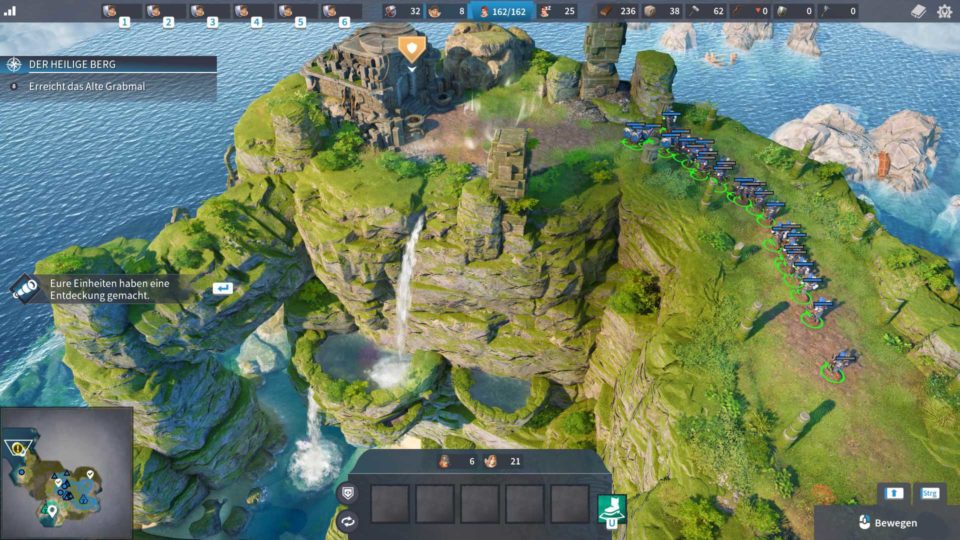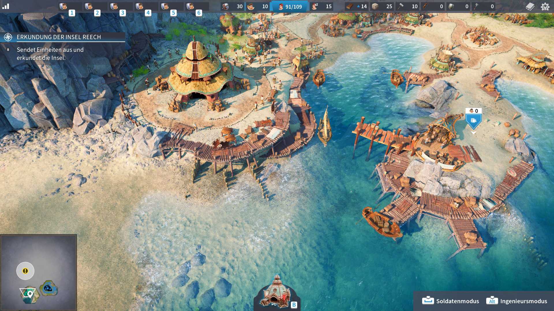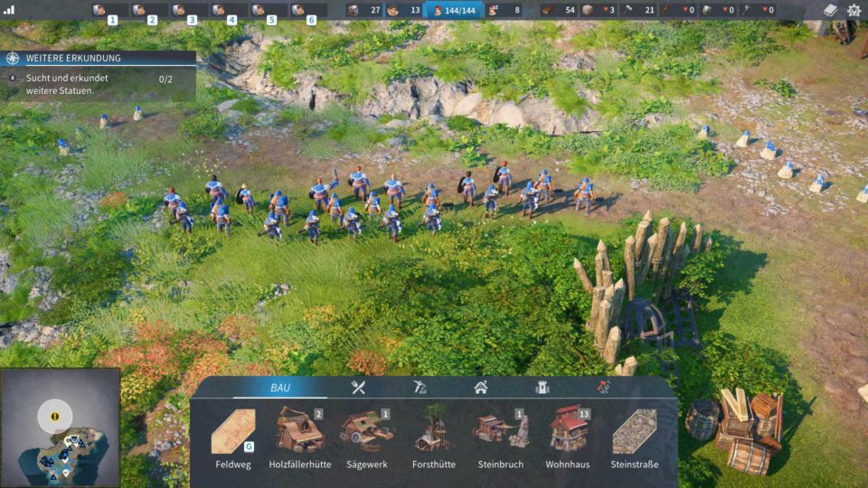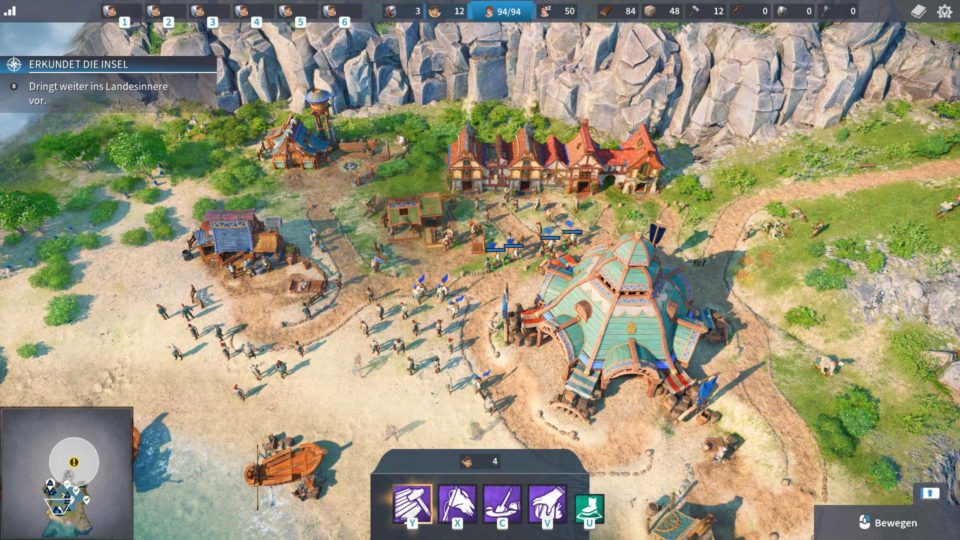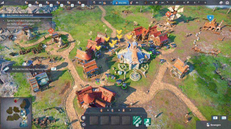 Unsere Ingenieure sind neben den Soldaten im Spiel die wichtigsten Einheiten, sie lassen sich direkt befehligen, können das Gebiet erweitern, Gebäude errichten und nach Rohstoffvorkommen suchen. Die Bevölkerung wird, sind genug Lebensmittel vorhanden, selbst versorgt, hier müssen wir nicht eingreifen. Auch lassen sich Gebäude nicht „upgraden“, lediglich die Forschung bringt etwas frischen Wind in das Aufbauszenario, welches allem in allem viel zu seicht ausfällt. Die Produktionsketten funktionieren meist schnell ohne gröbere Probleme und das eigene Volk ist wohl mit allen Entscheidungen, die wir treffen, zufrieden.